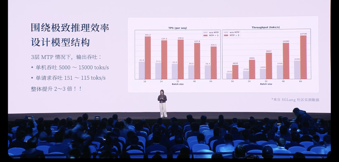 在实际场景里,三层MTP可以做到2到2.6倍的加速,单条回复能跑到150 token/s,全局吞吐可以拉到5000到15000 token/s。