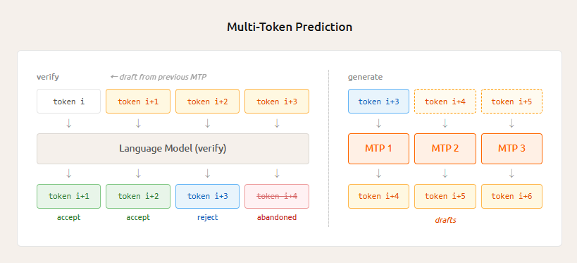 论文里会说得更技术一点,MTP可以作为“draft model”用于speculative decoding(推测解码),也就是先草稿、后验收的机制。