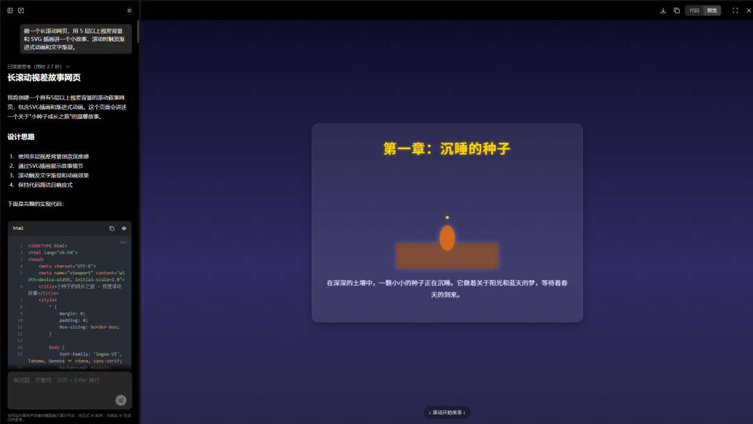 做一个长滚动网页,用 5 层以上视差背景和 SVG 插画讲一个小故事,滚动时触发渐进式动画和文字渐显。