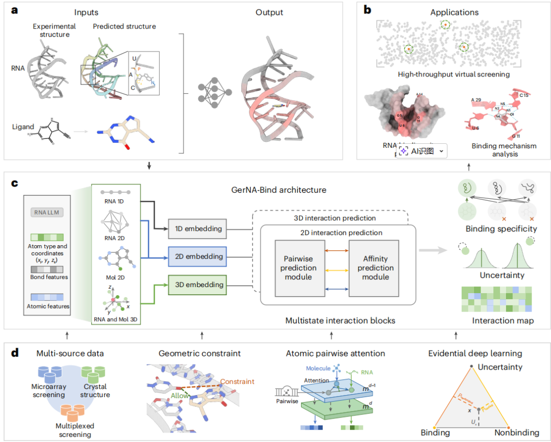 GerNA-Bind以RNA与配体结构为输入,RNA可来自实验解析或通过RNA折叠方法预测,配体亦包含对应的3D构象。GerNA-Bind具备高准确性、稳健性与可解释性,可用于RNA-配体结合特异性预测、靶向筛选、结合位点定位及作用机制分析。