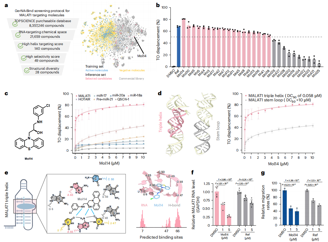 研究者们基于 Topscience 库构建了21,659个RNA-小分子化合物库,并用 GerNA-Bind 进行打分与不确定性筛选,最终挑选出 28 个优先候选。经 thiazole orange 位移实验验证,28个候选中18个(64%) 显示>50%位移,证明其发生结合;其中 Mol14、Mol10、Mol6 的位移率分别为 80.9% / 69.8% / 69.3%(参考阳性化合物为68.4%)。Mol14与已知的跟MALAT1结合的化合物相似度低(Tanimoto=0.17),表现出化学骨架的新颖性;竞争性位移与突变验证表明 Mol14 选择性识别 MALAT1 的三链位点(DC₅₀ = 58 nM),并在 A549 细胞中降低 MALAT1 表达且抑制细胞迁移。该案例展示了 GerNA-Bind 在湿实验验证闭环中的实际可用性与转化潜力。