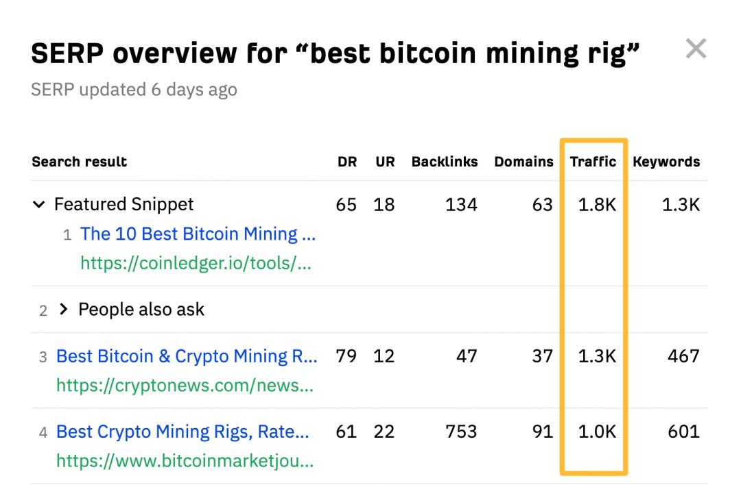 SERP Checker 能看到排名靠前的页面实际获得多少流量。比如 best bitcoin mining rig 这个词搜索量 500,但前三名每月能拿到 1000-1800 的访问量。