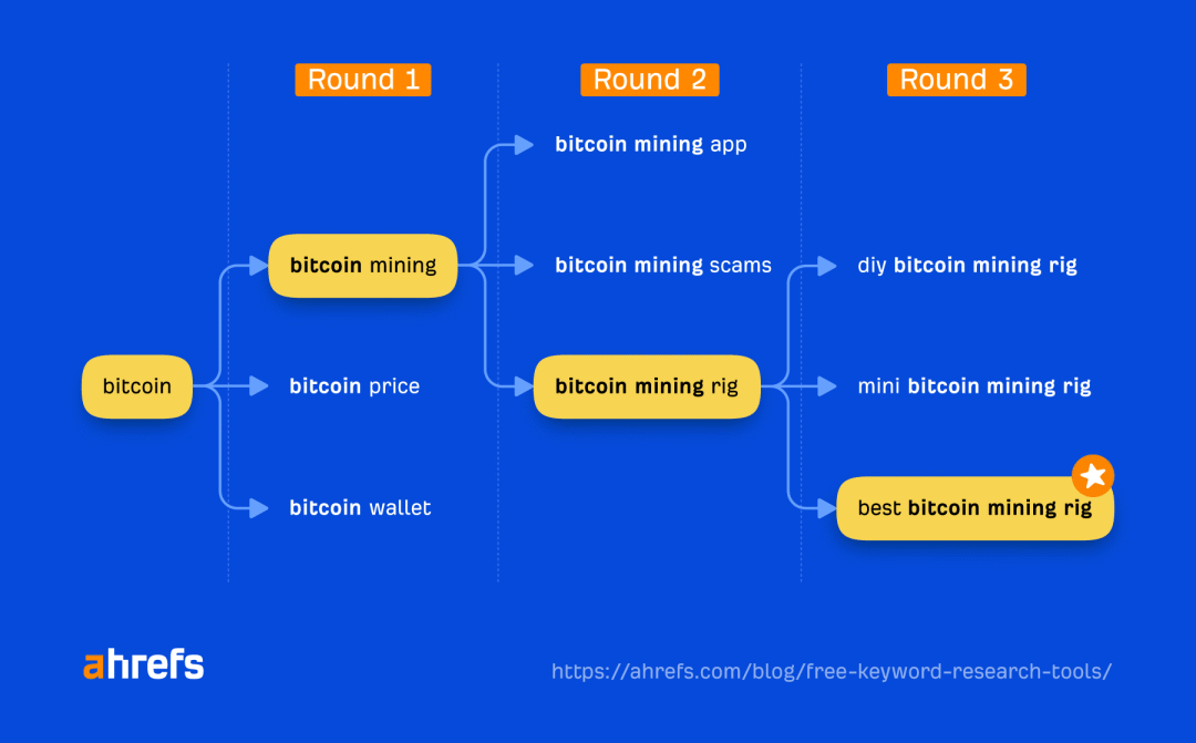 有个小技巧:如果觉得关键词还是太宽泛,把生成的词再扔进去跑一遍。比如 bitcoin 生成了 bitcoin mining,再把 bitcoin mining 放进去,关键词会越来越精准。