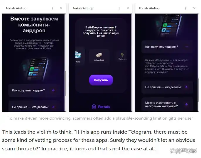 点击链接后,用户被导向一个高度仿真的Mini App。攻击者通常复制合法平台(如Portals Market)的UI组件,包括Logo、配色方案及按钮布局。关键伪造点包括: