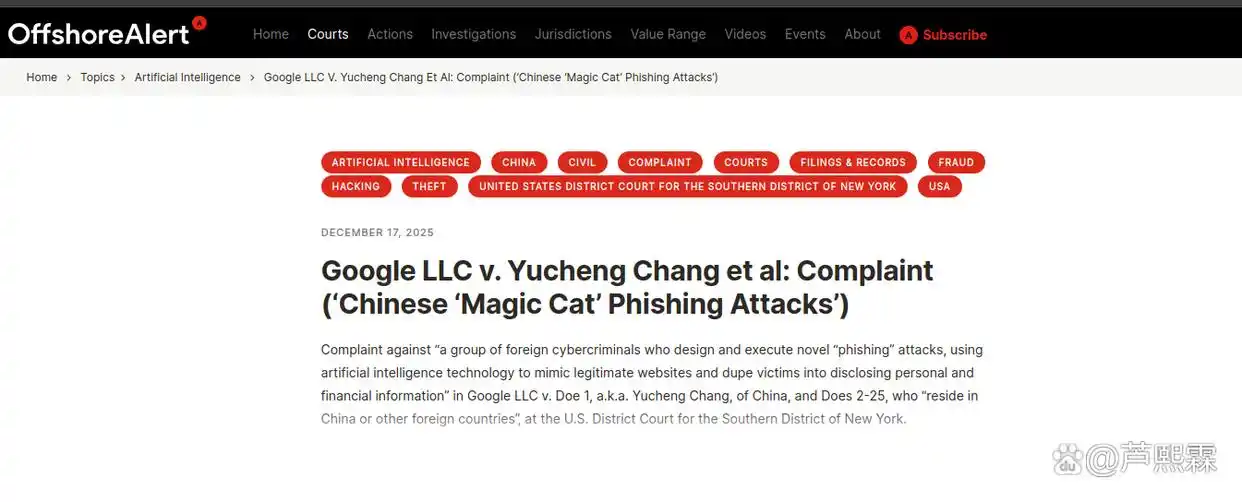 2025年初,谷歌在美国加利福尼亚北区联邦法院提起民事诉讼(Case No. 5:25-cv-XXXX),指控中国籍被告Yucheng Chang及其关联实体运营“魔猫”(Magic Cat)犯罪团伙,利用Darcula钓鱼套件实施系统性Smishing攻击。诉状指出,该团伙在2023至2024年间,通过批量注册Google Voice号码,结合iMessage的富媒体消息能力,向美国用户发送伪装成政府机构或公用事业公司的诈骗信息,日均发送量达数千条。受害者点击链接后,被导向高度仿真的钓鱼网站,输入信用卡号、社保号等敏感信息,造成重大经济损失。