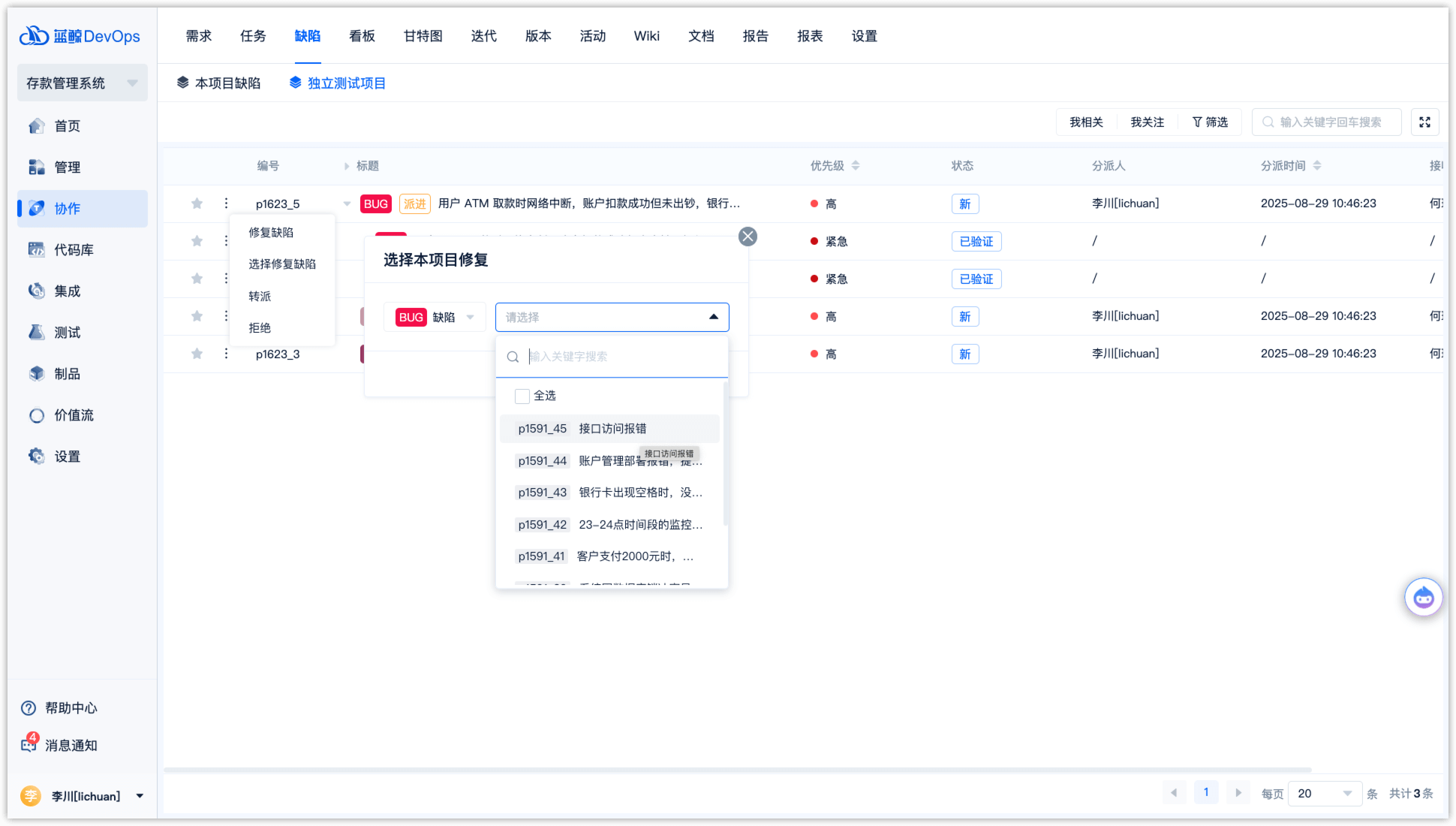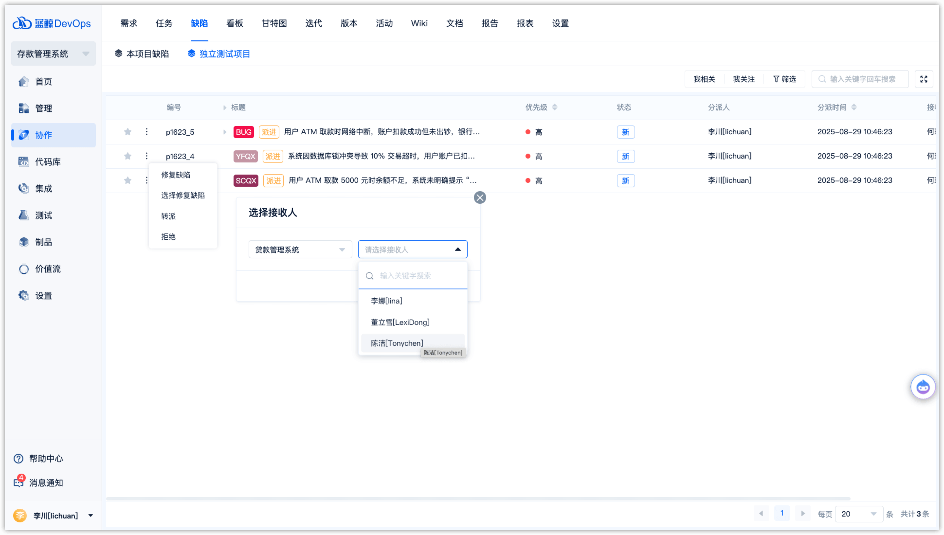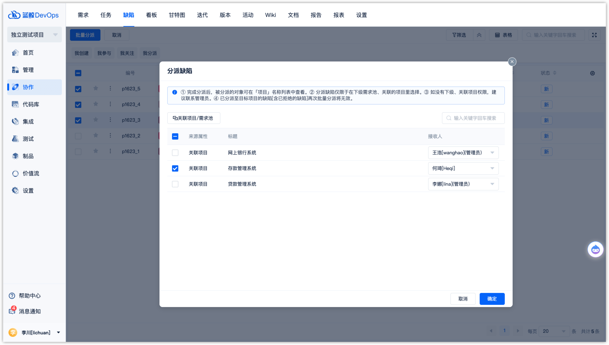 测试人员在测试过程中发现缺陷后,支持将批量分派缺陷至对应的研发项目接收处理,分派成功后系统将默认记住研发项目的接收人,提升分派效率。
