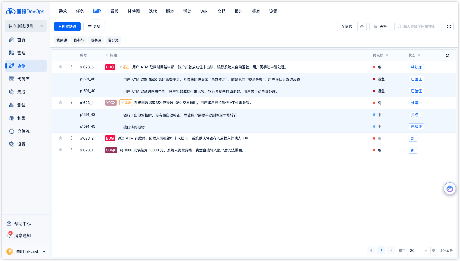 嘉为蓝鲸敏捷协同平台·CTeam以 “缺陷全流程管理闭环” 为核心,通过 “测试集中管理-研发精准处理-全链路数据打通” 的闭环设计,提升测试团队与研发团队的协同效率,破解“单测多研”模式下的质量管理难题。