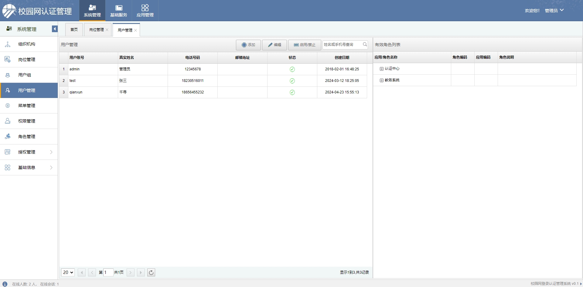 用户管理:在此模块下对系统用户进行管理,可以在此模块下查看用户信息、新增用户、编辑用户资料以及删除用户;