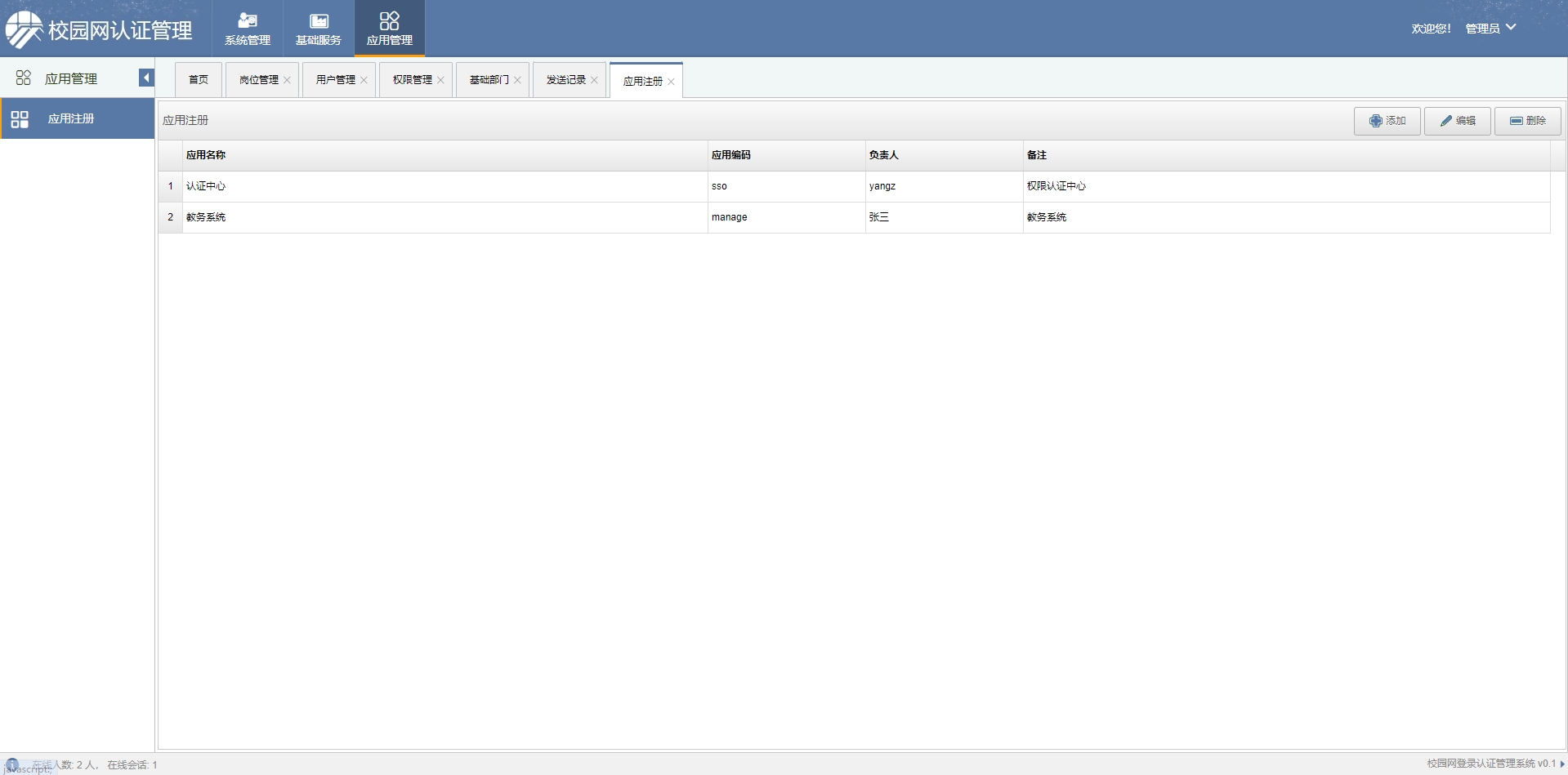 应用管理:对系统中添加的应用进行管理,也可在此模块下添加新的应用来授权给用户。