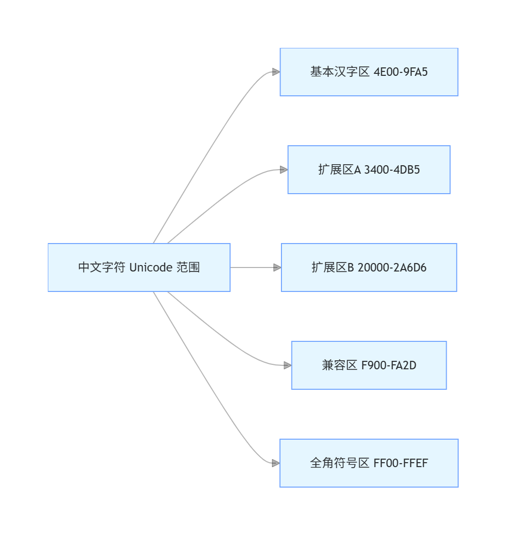 4E00 - 9FA5FF00 - FFEFF900 - FA2D3400 - 4DB520000 - 2A6D6了解这些范围后,我们可以通过检查字符的Unicode值来判断一个字符是否属于中文字符。