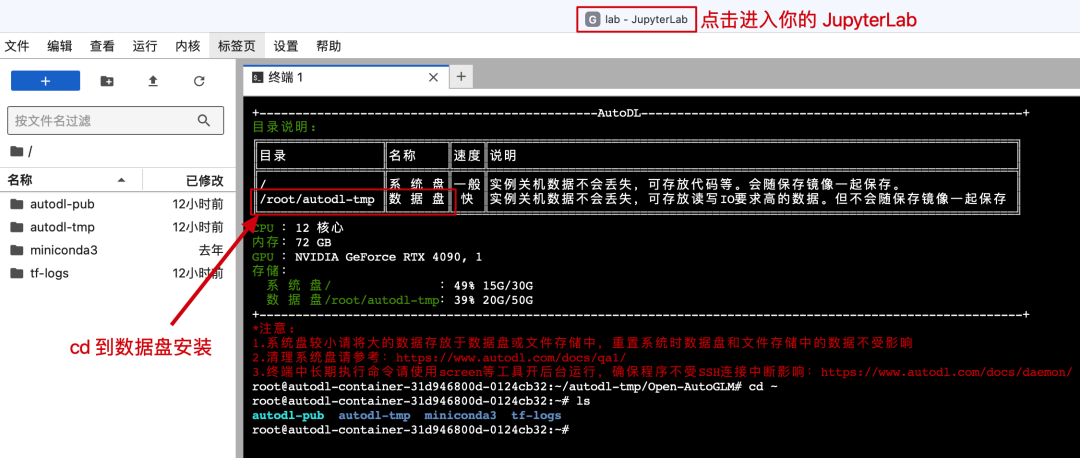 /root/autodl-tmp 下,否则系统盘安装满了,就不能运行了。