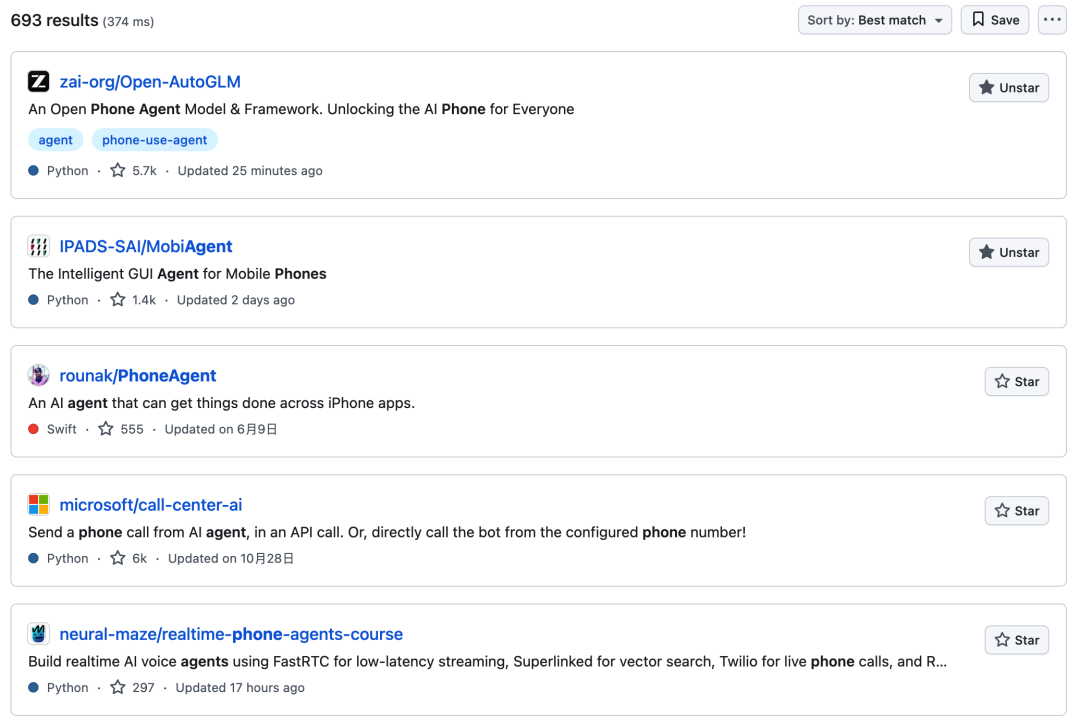 device-id 94343646 就是 adb 列出来的设备ID,base-url 是你的服务地址,之后可以自行验证,测试各种 APP 的启动,使用等。📢 接下来,在phone + agent 这个方向,将有越来越多的模型和产品。检索:https://github.com/search?q=phone%20agent&type=repositories