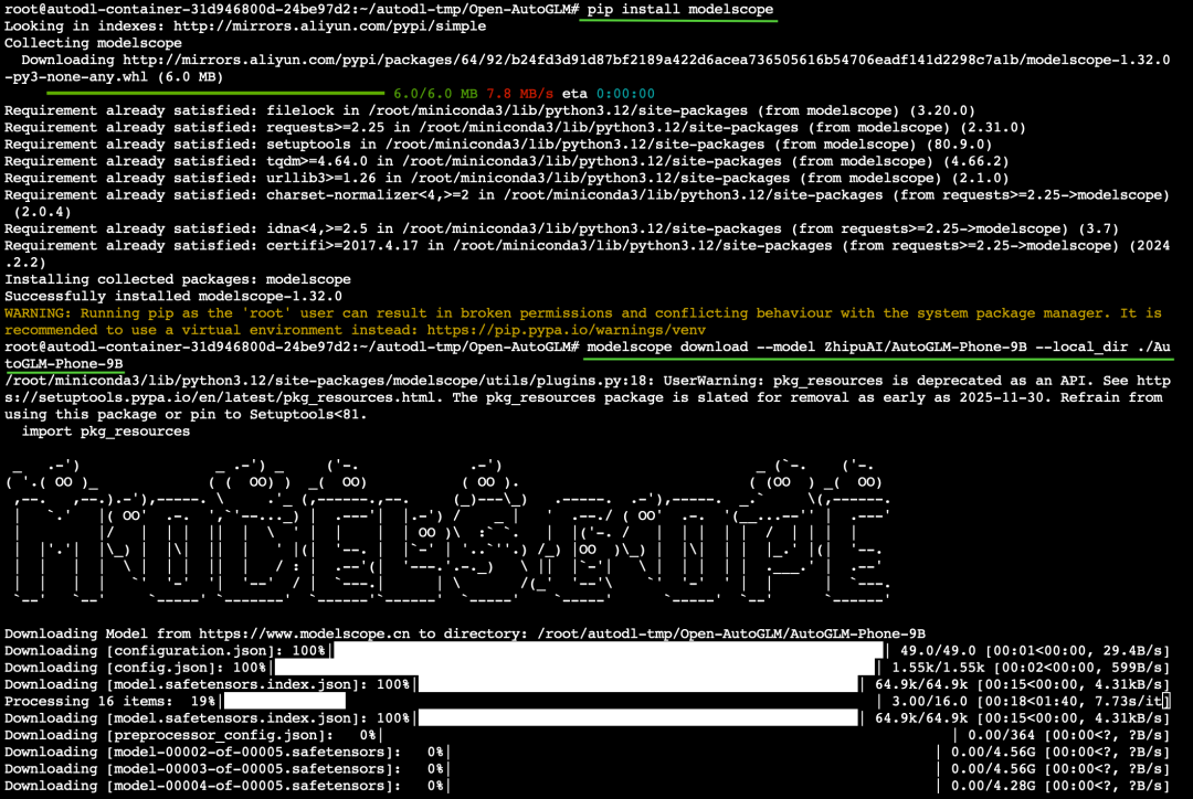pip config set global.index-url https://pypi.tuna.tsinghua.edu.cn/simplecd Open-AutoGLM 以此执行安装脚本。这个过程需要一段时间。如果有失败,可以重复执行脚本。下载模型是为了启动 Open-AutoGLM,如果不手动下载,默认执行脚本速度比较慢,同时可能把文件安装到系统盘中。