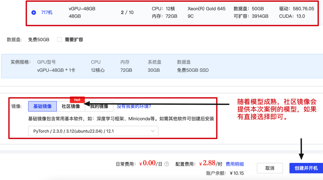注意,选择2卡,单卡24G的,否则大概率会失败。