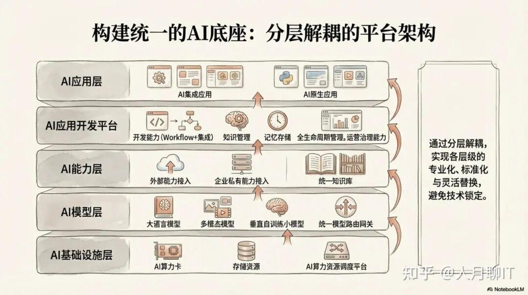 一个健壮的企业级AI平台必须采用分层解耦的架构设计,以确保战略灵活性和技术可扩展性。其典型的分层架构如下: