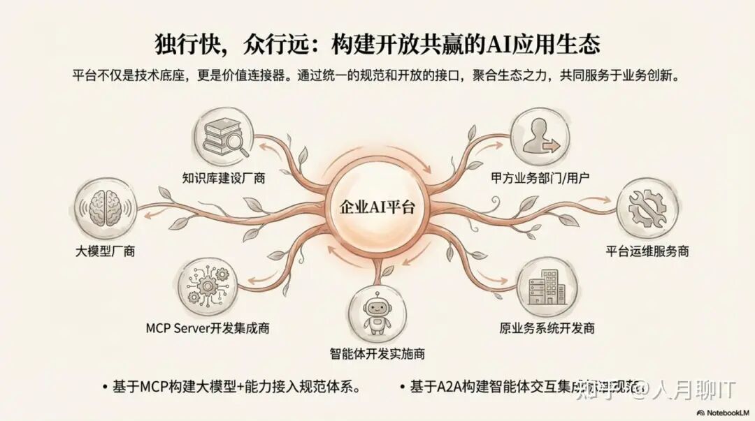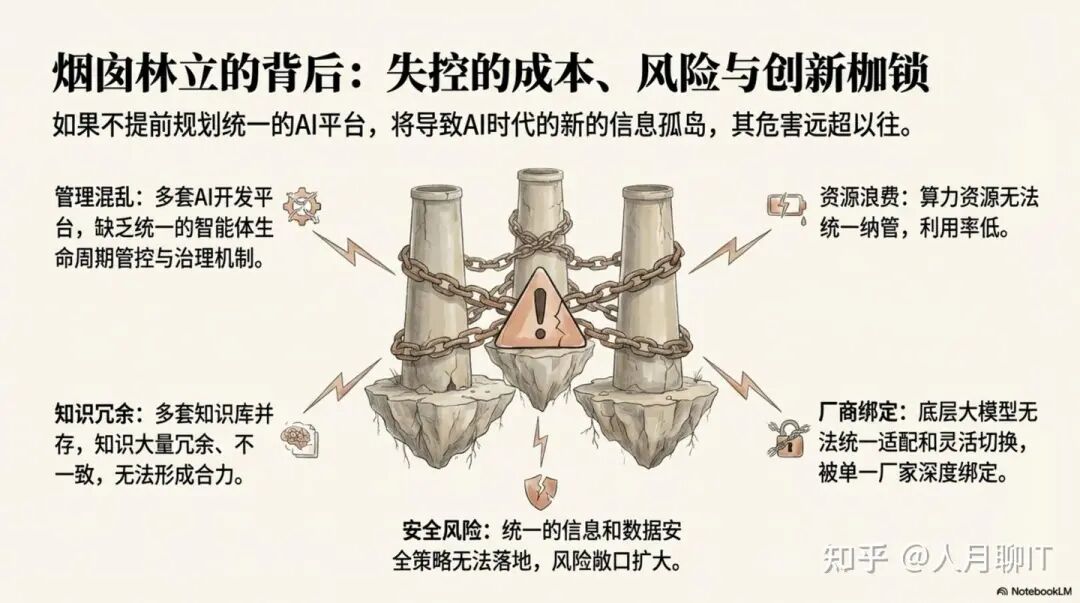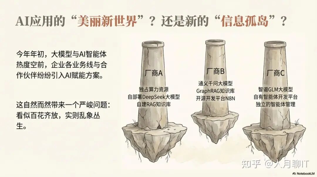 近期与一家大型客户的战略研讨中,一个典型的困境浮出水面:该企业虽已引入多家合作伙伴的AI解决方案,但在实践中,不同厂商各自为政——采用不同的大模型,构建独立的RAG知识库,部署多样的开源开发平台。这种看似敏捷的“百花齐放”,最终却在企业内部构筑起“垂直烟囱式的一个个AI智能体的信息孤岛”。这已成为阻碍企业释放AI全部潜能的核心痛点。