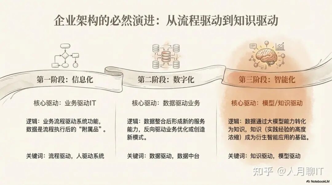 要理解平台化的架构必然性,我们必须审视企业IT架构的演进脉络,它清晰地揭示了核心驱动力从“流程”到“数据”再到“知识”的升维路径。