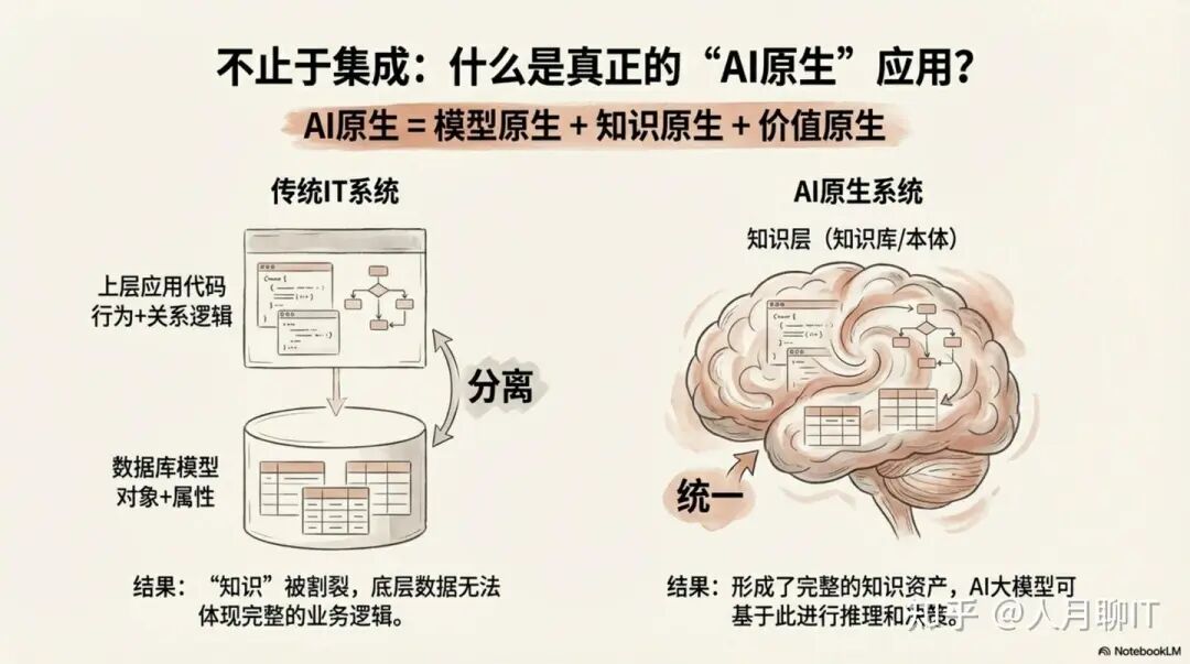 传统IT系统与AI原生系统的根本区别,在于对“知识”的架构性处理。在传统系统中,数据存储在数据库,而业务逻辑和关系规则则被固化在上层应用的代码中。AI原生系统则致力于将这些隐性的业务逻辑下沉,并模型化地沉淀到知识层。
