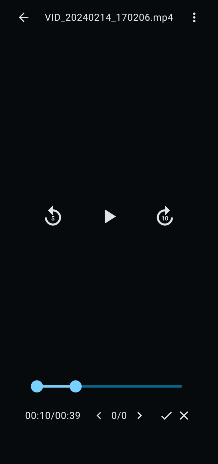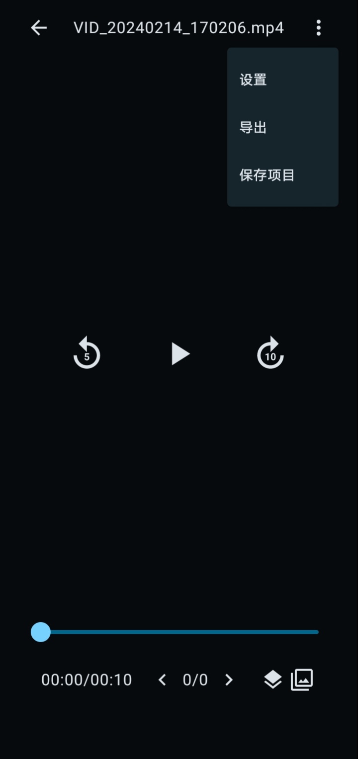 分别拖动两个圆珠确定裁剪的起止时间后,点击右下角的打勾按钮,此时进度条长度变为视频片段的持续时间比如10秒。点击界面右上角的三点按钮,弹出操作菜单列表如下图所示: