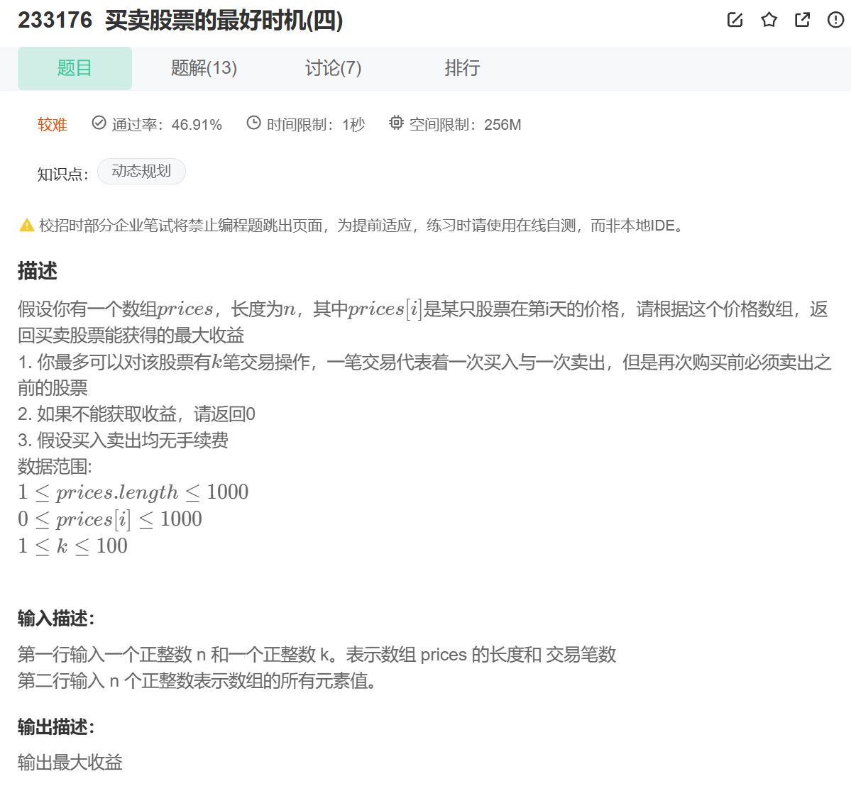本题中,我们最多只能完成2笔交易。并且第一笔交易完成后才能进行第二笔交易。