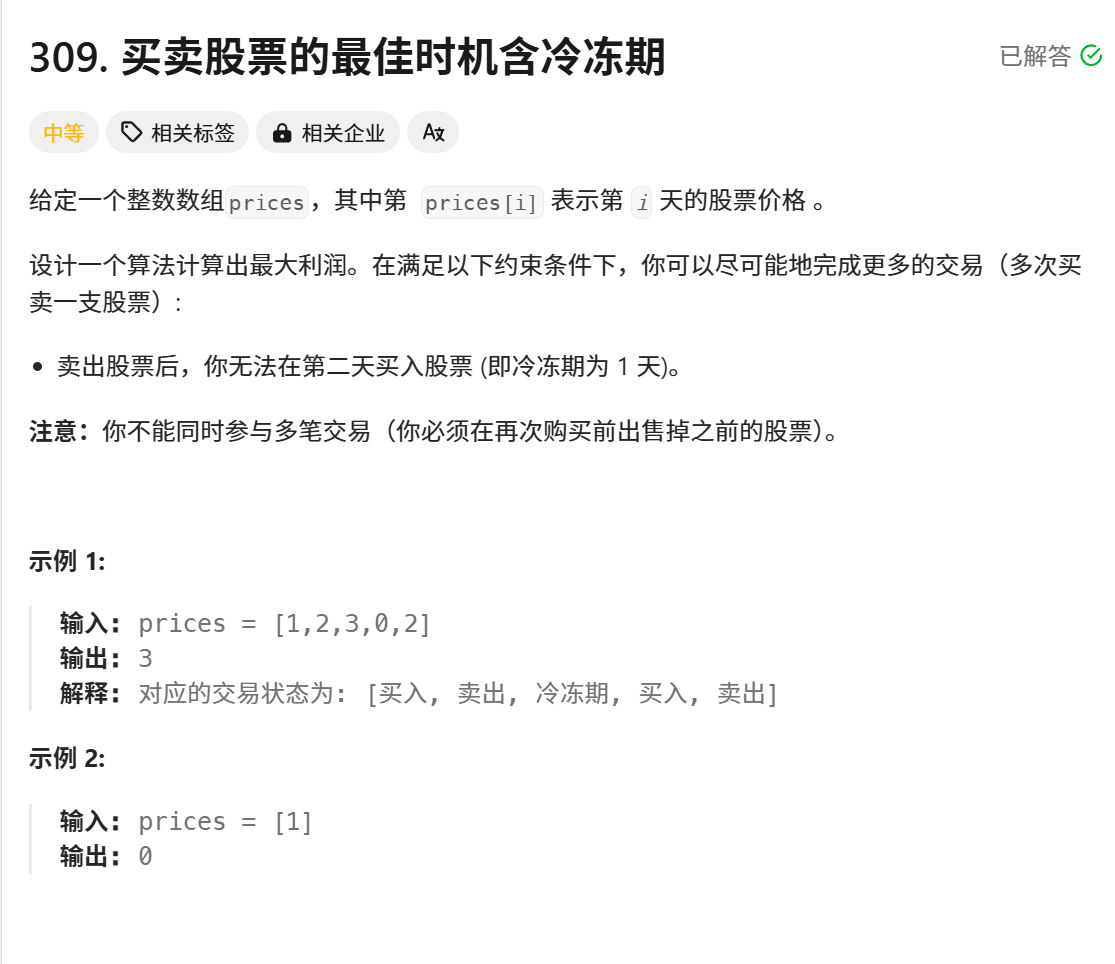 本题包含冷冻期,在卖出股票后的一天,进入冷冻状态,无法买入股票。