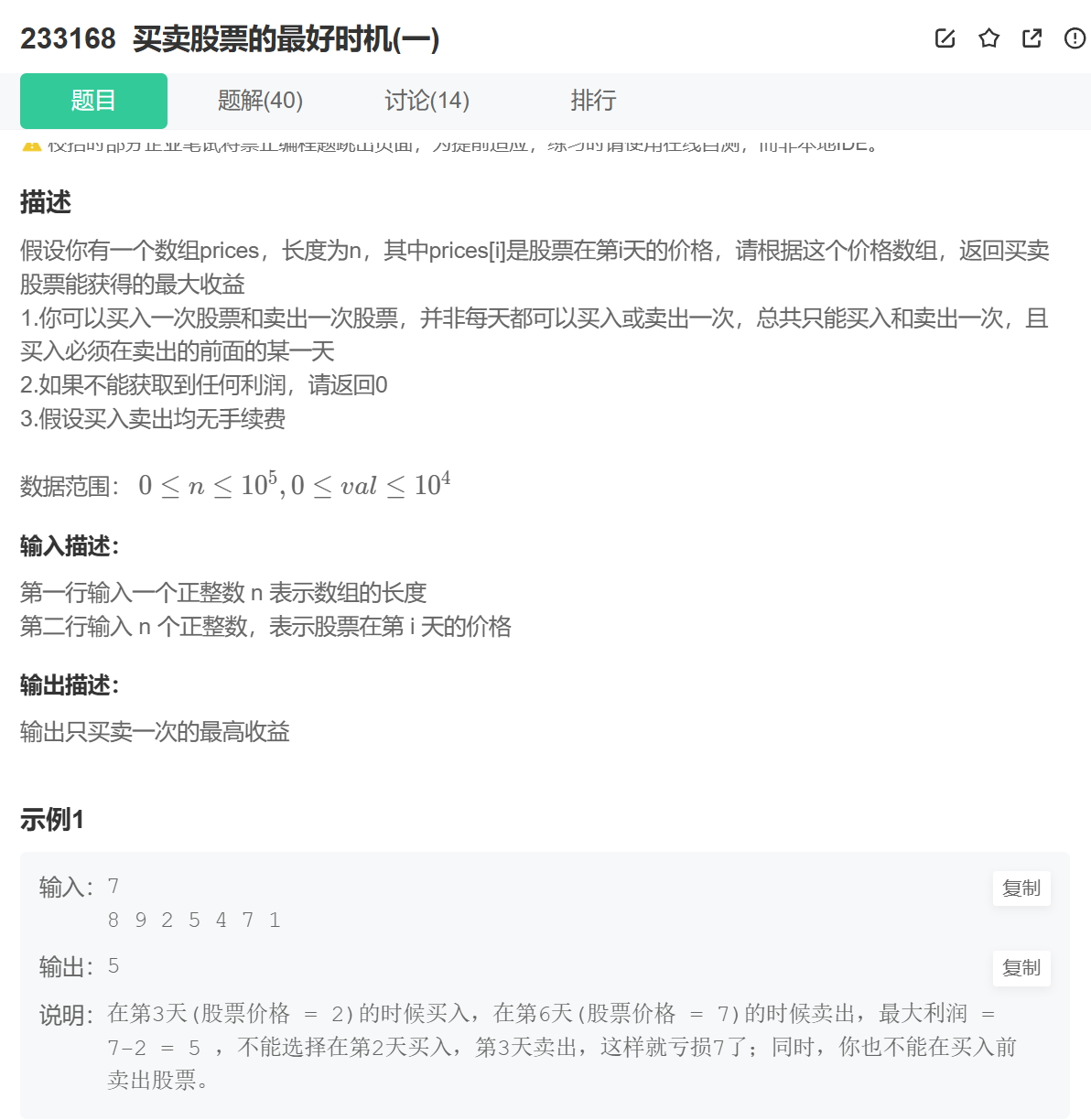 有一个价格数组prices,表示第i天的股票价格为prices[i],整个过程只能买入股票和卖出股票一次。并且买入股票必须再卖出股票之前。