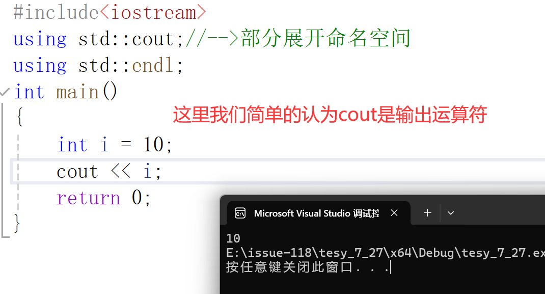 int i=10;std::cout<<i; 把i这个类型的对象转换成字符串插入到cout中,然后输出; std::cout<<i 的特点是自动识别类型,并且不同类型可以连续在一起; 任何变量都转换成字符串插入到流中(可以认为是控制台)