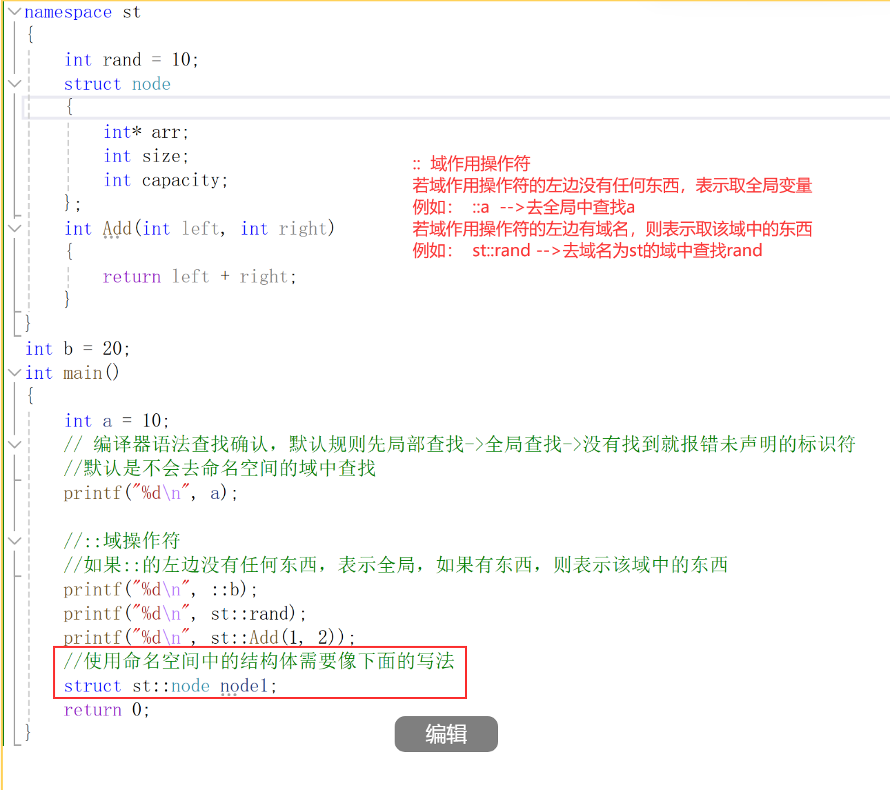 提醒:namespace 域名 { } 其中 { } 的括号后面没有“;”,这个要和定义结构体要有区别