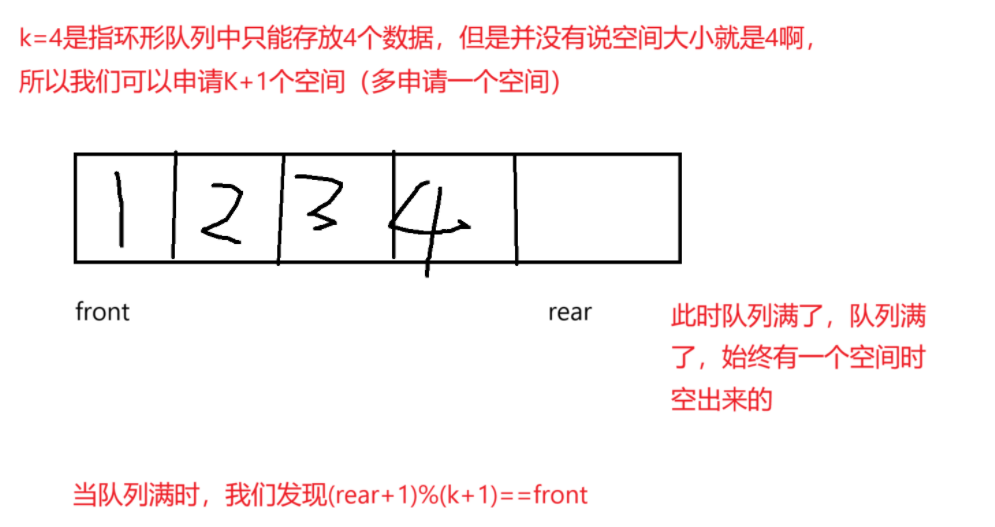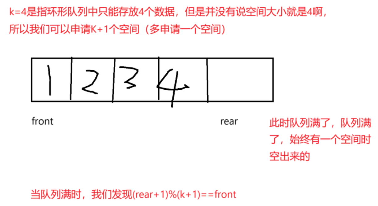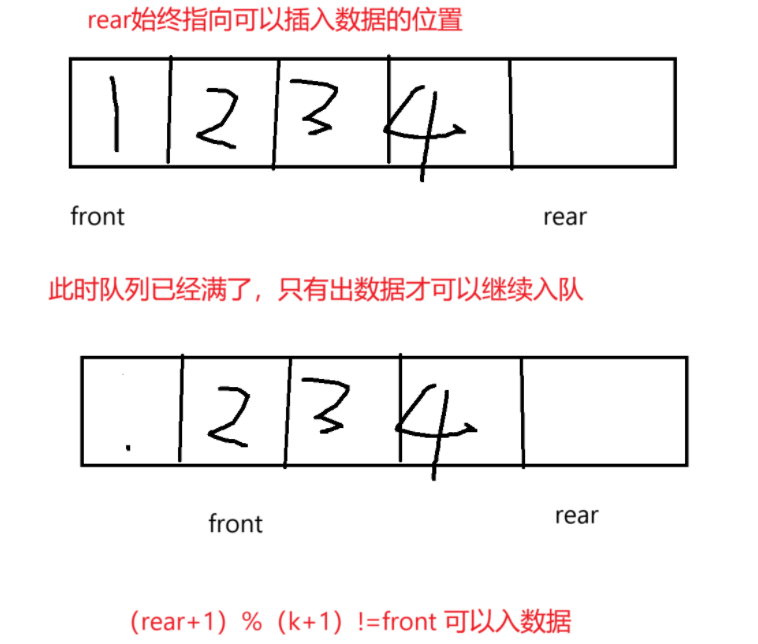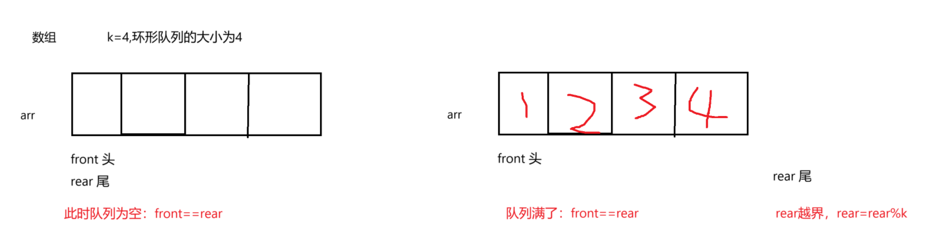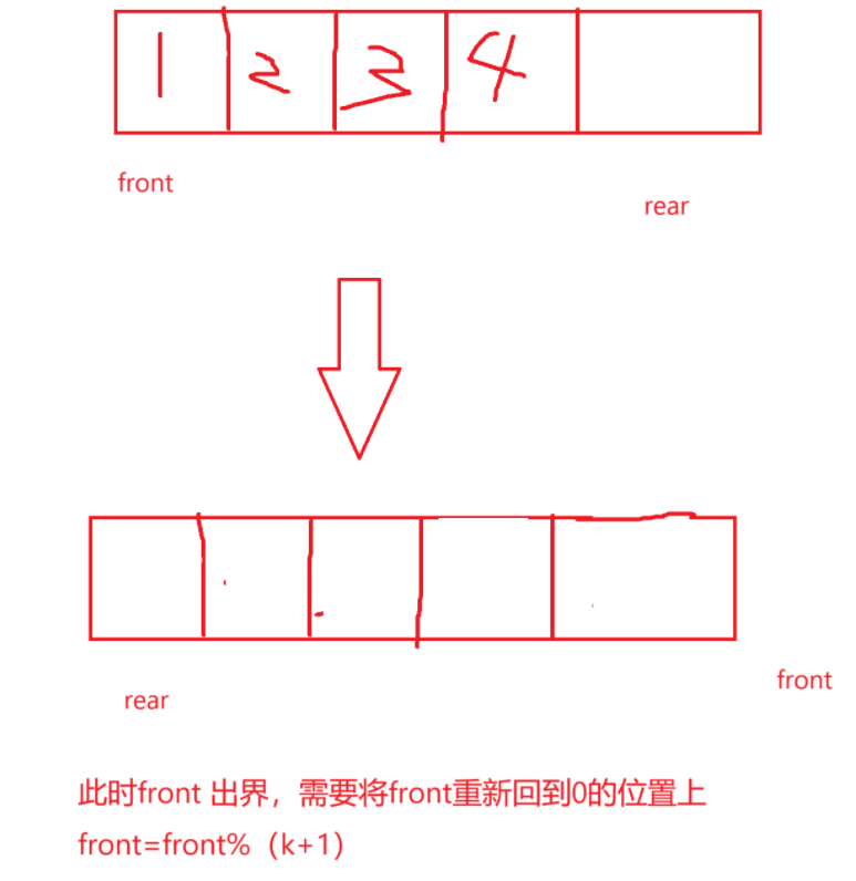 当rear越界时,我们需要将rear返回0开始,rear=rear%k,此时rear==front