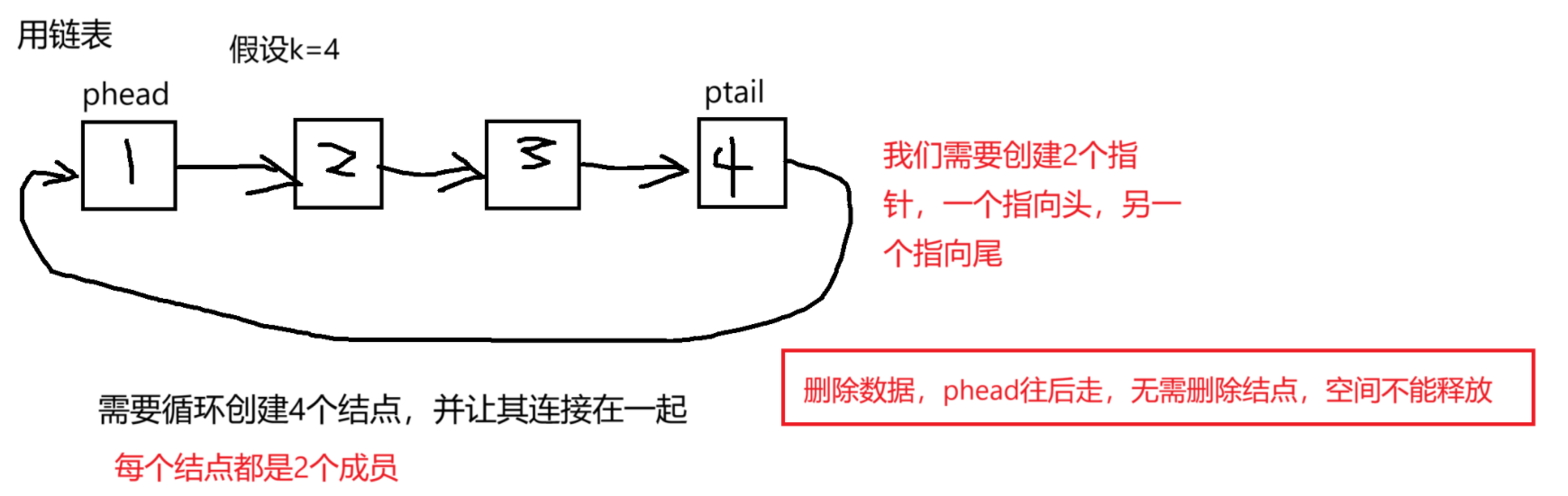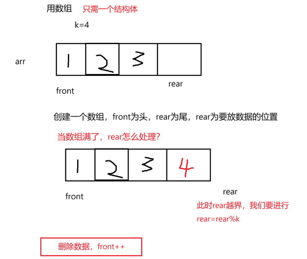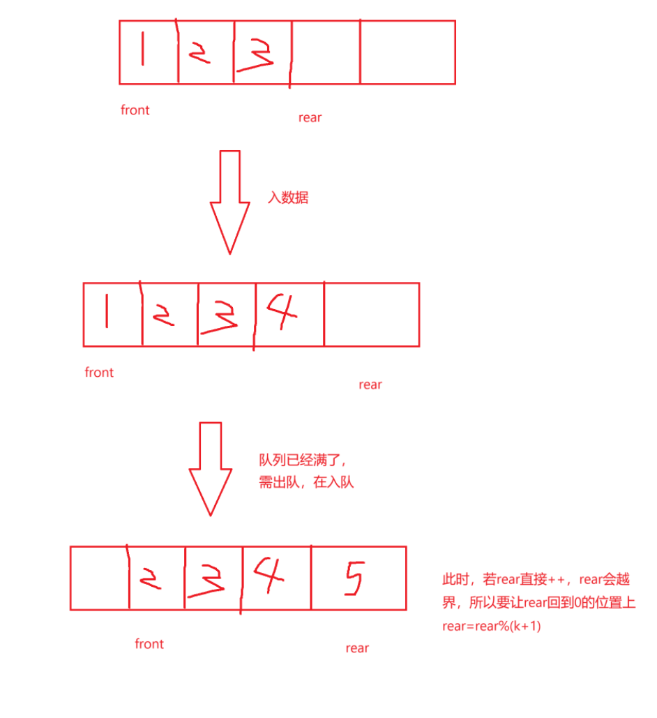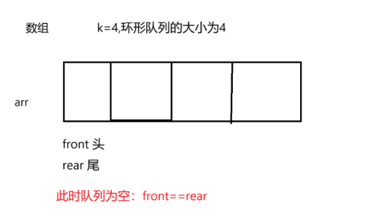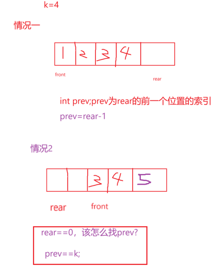 当rear越界时,我们需要将rear返回0开始,rear=rear%k,此时rear==front