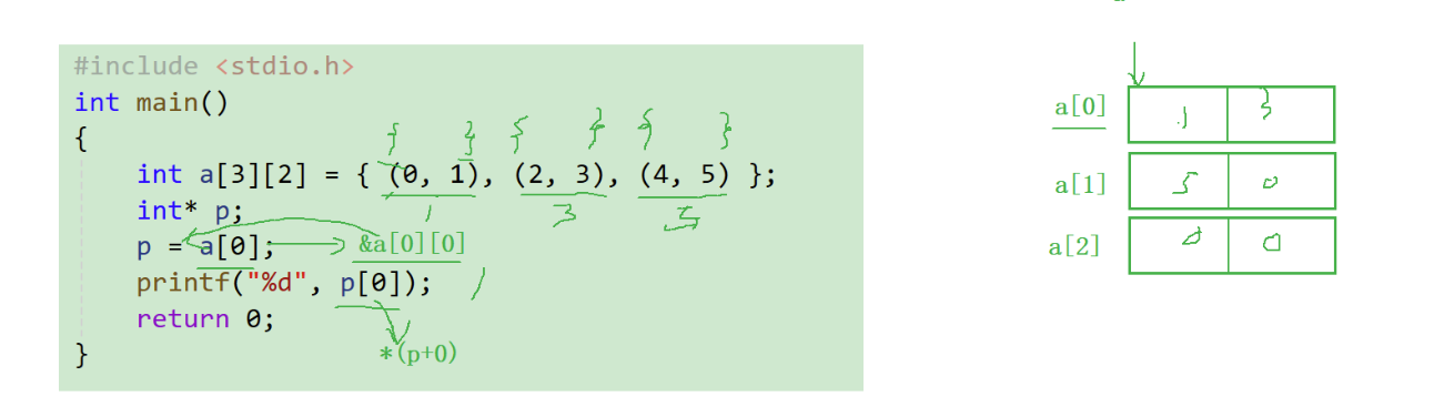 }这道题我们先来看看二维数组中的内容,{(0,1),(2,3),(4,5)},我们可以很清晰的看出这给大括号中的内容是由三个小括号组成,根据我们前面所学习的内容,可以快速反应出这是个逗号表达式,整个表达式的结果是最后一个表达式的结果,所以二维数组中的内容应该是{1,3,5}