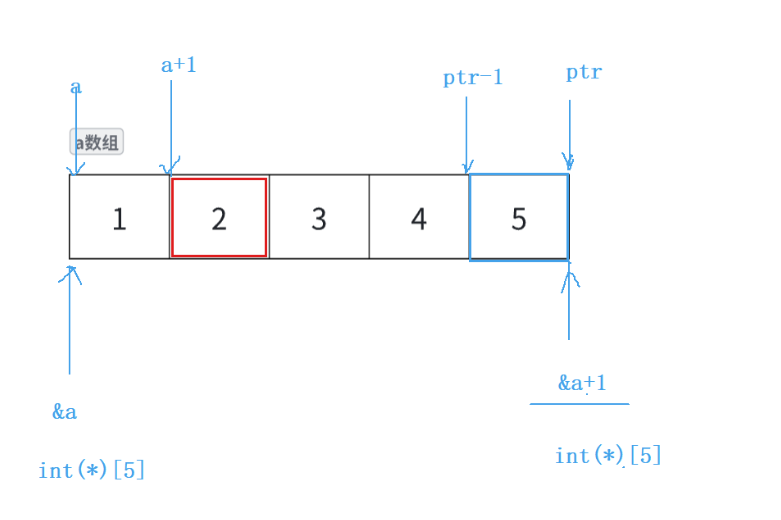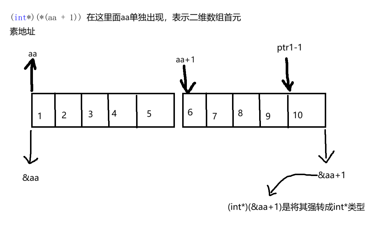 int* ptr1 = (int*)(&aa + 1); &aa是去除整个二维数组的地址,&aa + 1是跳过整个二维数组 (int*)(&aa + 1)将类型强转成int*类型 int* ptr2 = (int*)(*(aa + 1)); 上面代码中的aa单独出现,表示数组首元素的地址,二维数组首元素的地址是第一行的地址 aa + 1是跳过一个类型为int(*)[5]的数组,表示第二行的地址 *(aa + 1)==aa[1],aa[1]为二维数组第二行的数组名,这里的数组名表示数组首元素的地址