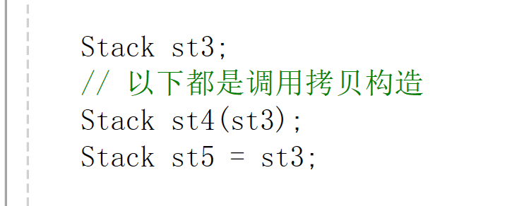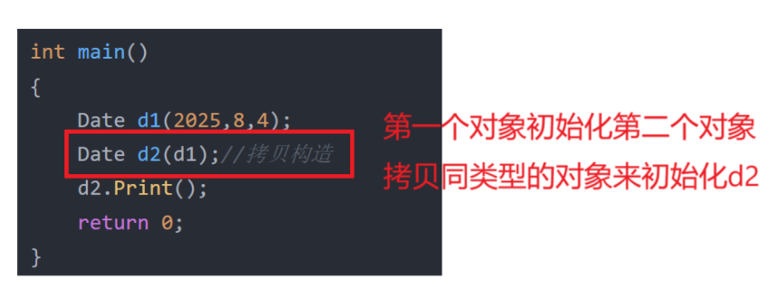 拷贝构造使用于当前类型的对象去初始化当前类型的另一个要创建的对象,换句话来说就是当你完成的是自身这个类型的拷贝初始化就会用拷贝构造,拷贝构造函数是构造函数的一个重载。