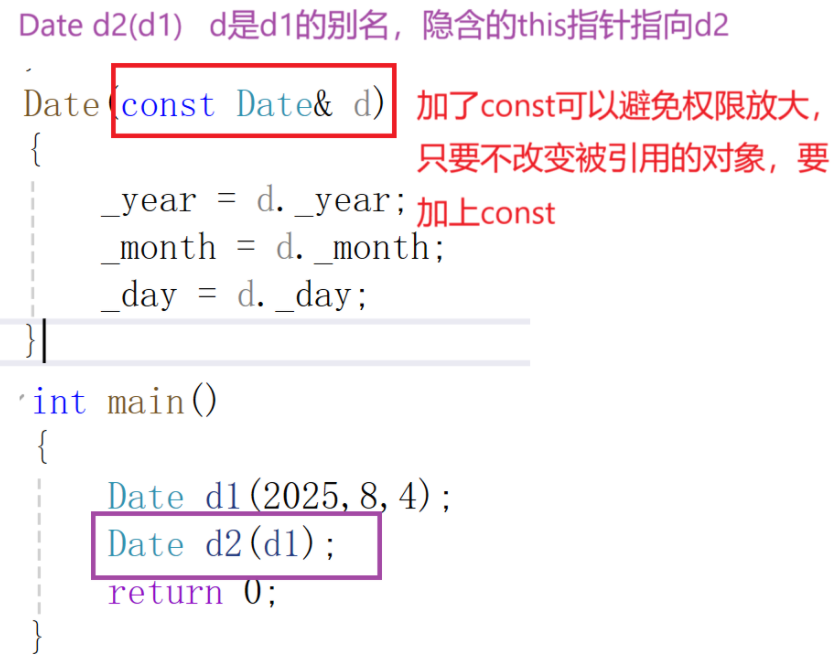 如果一个构造函数的第⼀个参数是自身类类型的引用,且任何额外的参数都有默认值,则此构造函数也叫做拷贝构造函数,也就是说拷贝构造是⼀个特殊的构造函数。