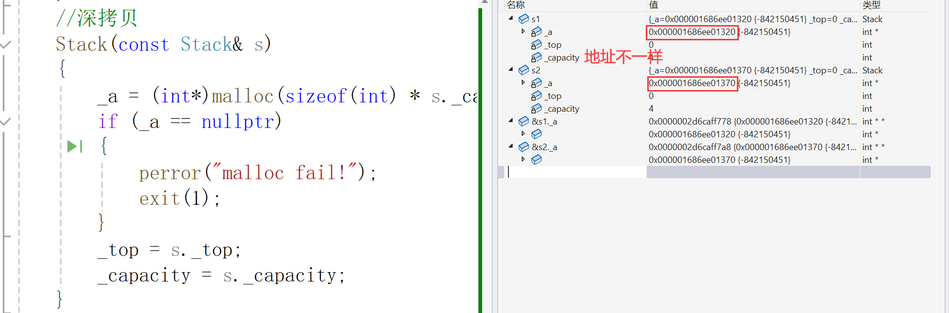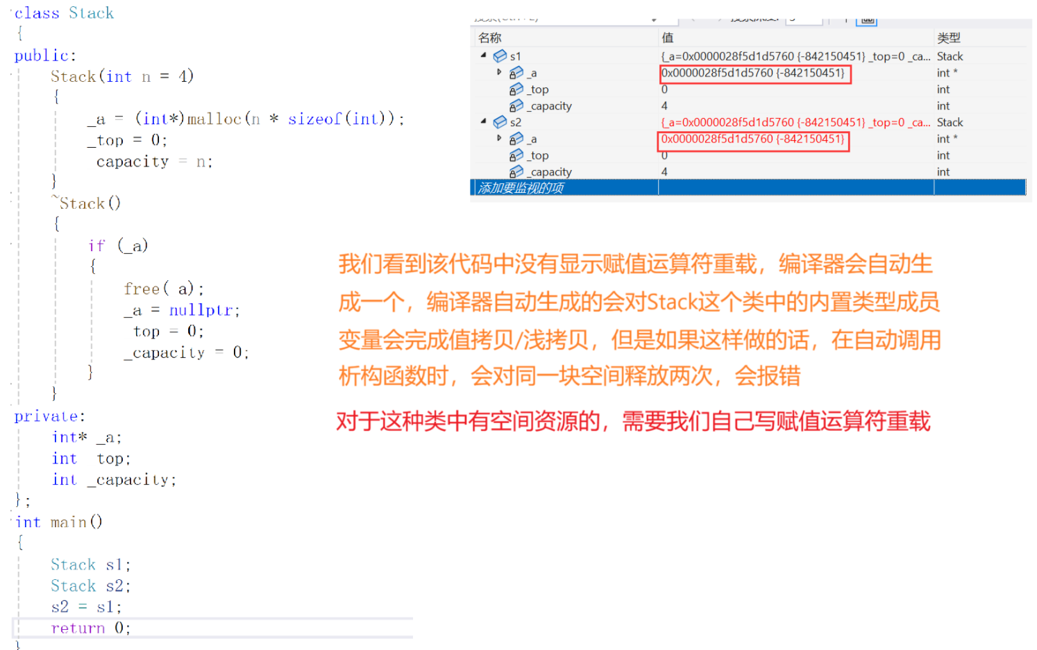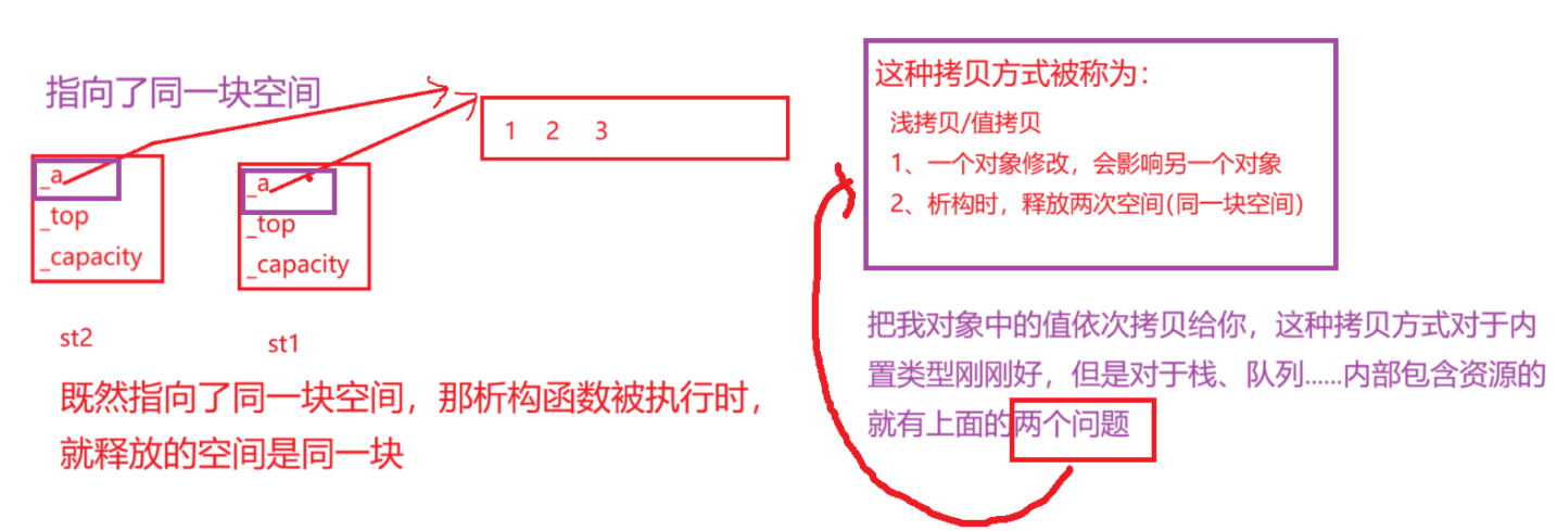 Stack这样的类,虽然也都是内置类型,但是_a指向了资源,编译器自动生成的拷贝构造完成的值拷贝/浅拷贝不符合我们的需求,所以需要我们自己实现深拷贝(对指向的资源也进行拷贝)。