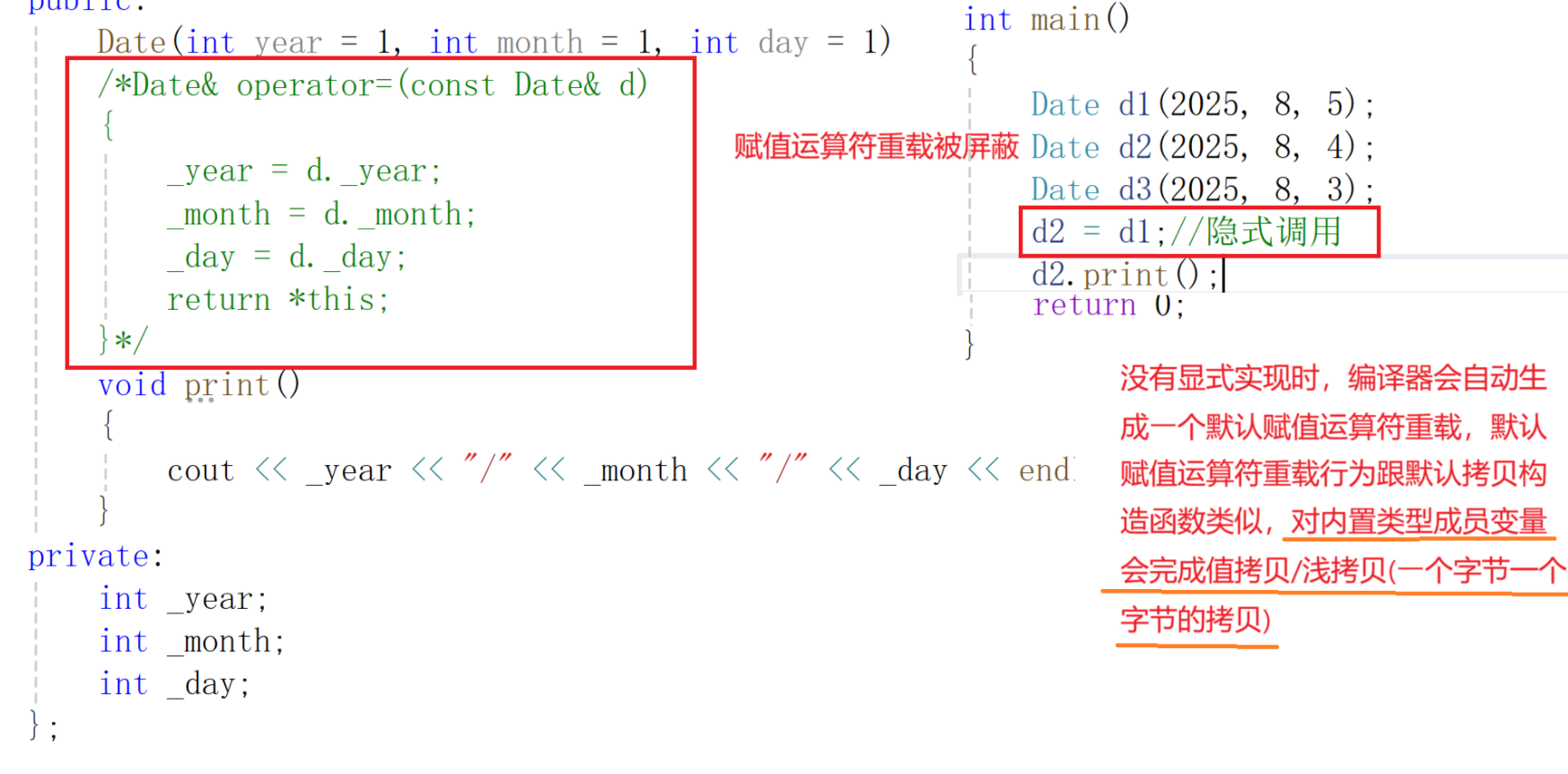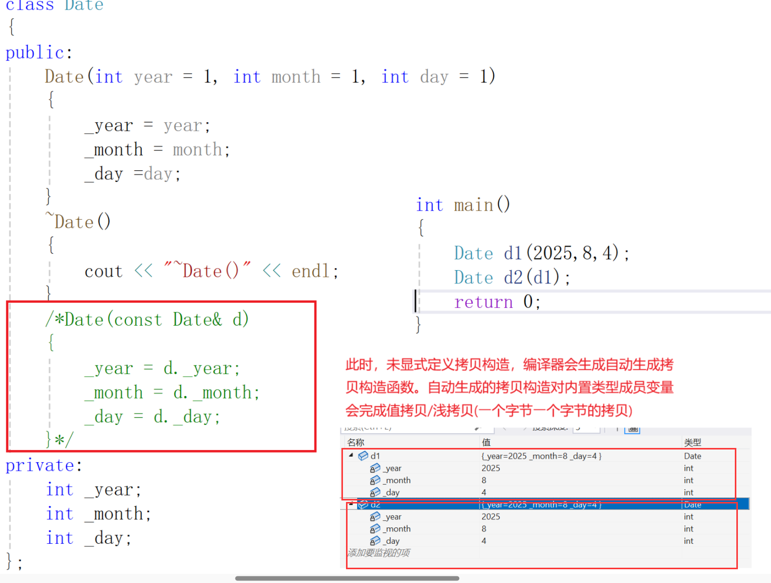 前面我们学习的构造函数和析构函数,当我们不写时,编译器自动生成的构造函数和析构函数对内置类型成员不做处理,自定类型成员会调用他的析构函数。但是拷贝构造有点不同:若未显式定义拷贝构造,编译器会生成自动生成拷贝构造函数。自动生成的拷贝构造对内置类型成员变量会完成值拷贝/浅拷贝(⼀个字节⼀个字节的拷贝),对自定义类型成员变量会调用他的拷贝构造。