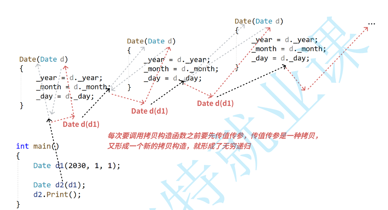 每次要调用靠别构造函数之前要进行传值传参,传值传参是一种拷贝,又形成一个新的拷贝构造,调用新的拷贝构造之前要进行传值传参,传值传参是一种拷贝,又形成一个新的拷贝构造,以此下去,就形成了无穷递归,但是当我们使用引用传参时,就不需要进行拷贝构造,这样就不会形成无穷递归了,所以我们使用引用传参。