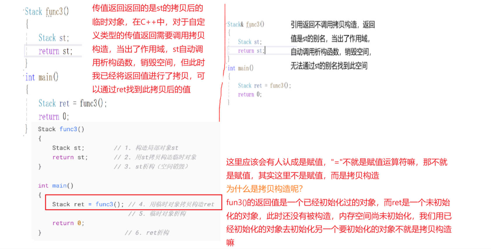 总结: C++规定自定义类型对象进行拷贝行为必须调用拷贝构造,所以这里自定义类型传值传参和传值返回都会调用拷贝构造完成。