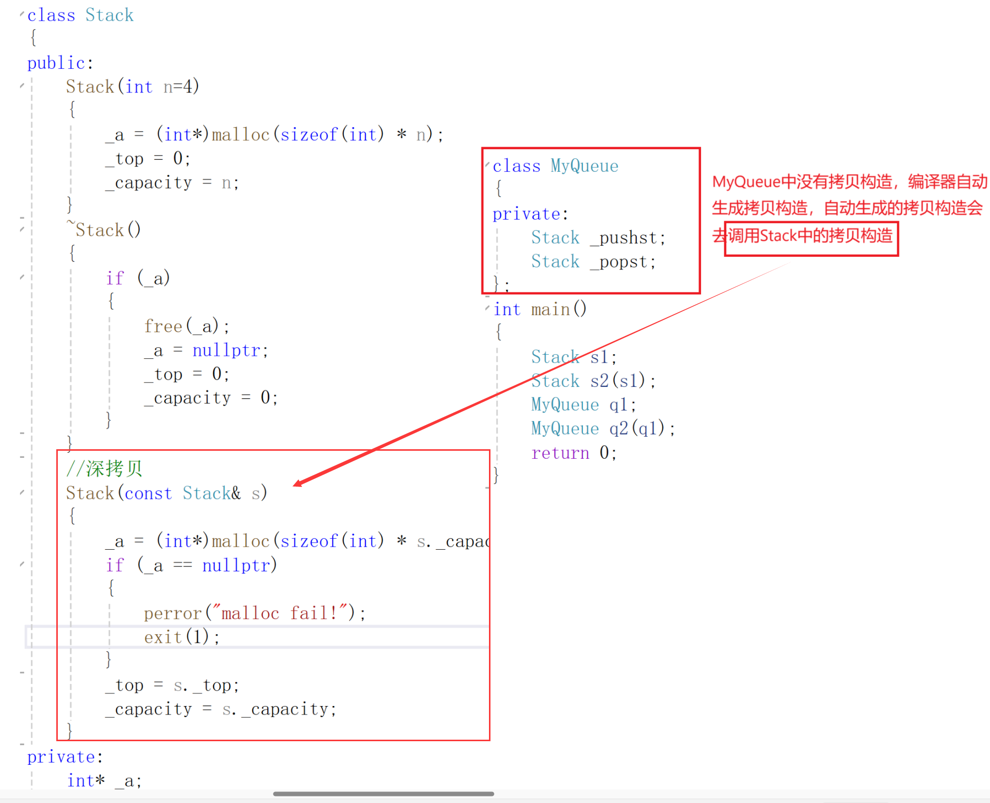 总结:像Date这样的类成员变量全是内置类型且没有指向什么资源,编译器自动生成的拷贝构造就可以完成需要的拷贝,所以不需要我们显示实现拷贝构造。像Stack这样的类,虽然也都是内置类型,但是_a指向了资源,编译器自动生成的拷贝构造完成的值拷贝/浅拷贝不符合我们的需求,所以需要我们自己实现深拷贝(对指向的资源也进行拷贝)。像MyQueue这样的类型内部主要是自定义类型Stack成员,编译器自动生成的拷贝构造会调用Stack的拷贝构造,也不需要我们显示实现MyQueue的拷贝构造。