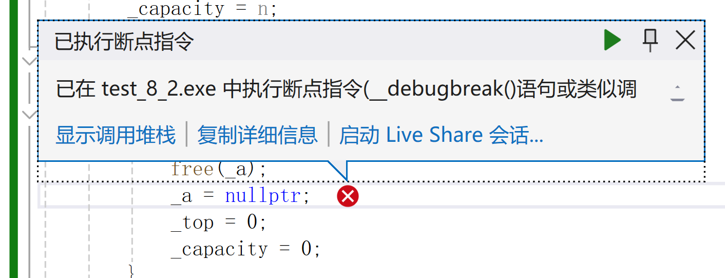这是什么原因呢?当我们调试编译器的时候,返现拷贝构造时没有发生任何错误,但是当我们执行到第二次析构函数的时候,此时发生了报错,只是因为编译器对空间进行了两次释放(同一块空间)