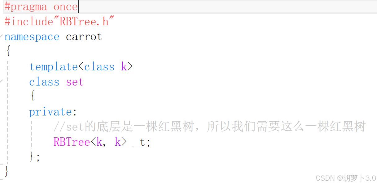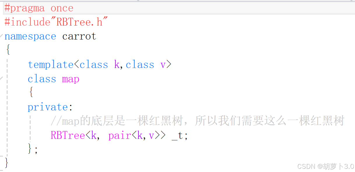 由于 std::map 和 std::set 的底层通常使用红黑树实现,因此在我们自定义的 map 和 set 类中,需要在私有成员区域定义一个红黑树对象作为底层容器。