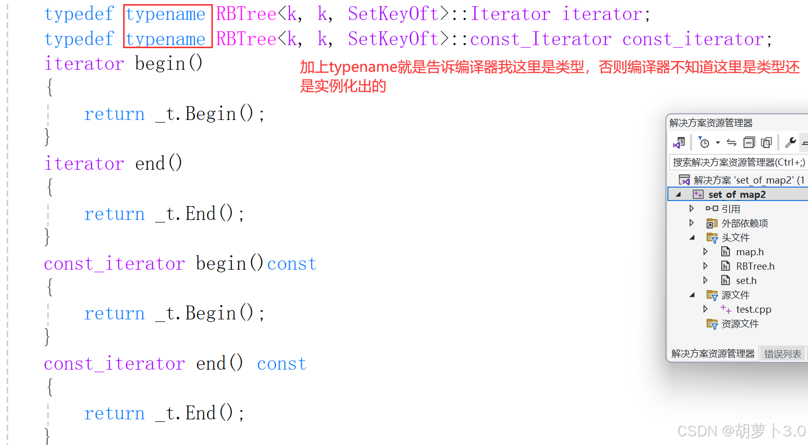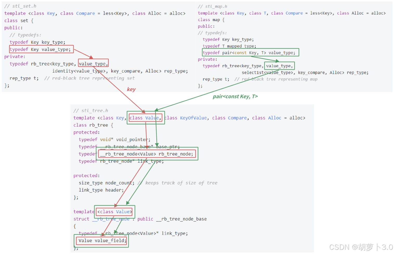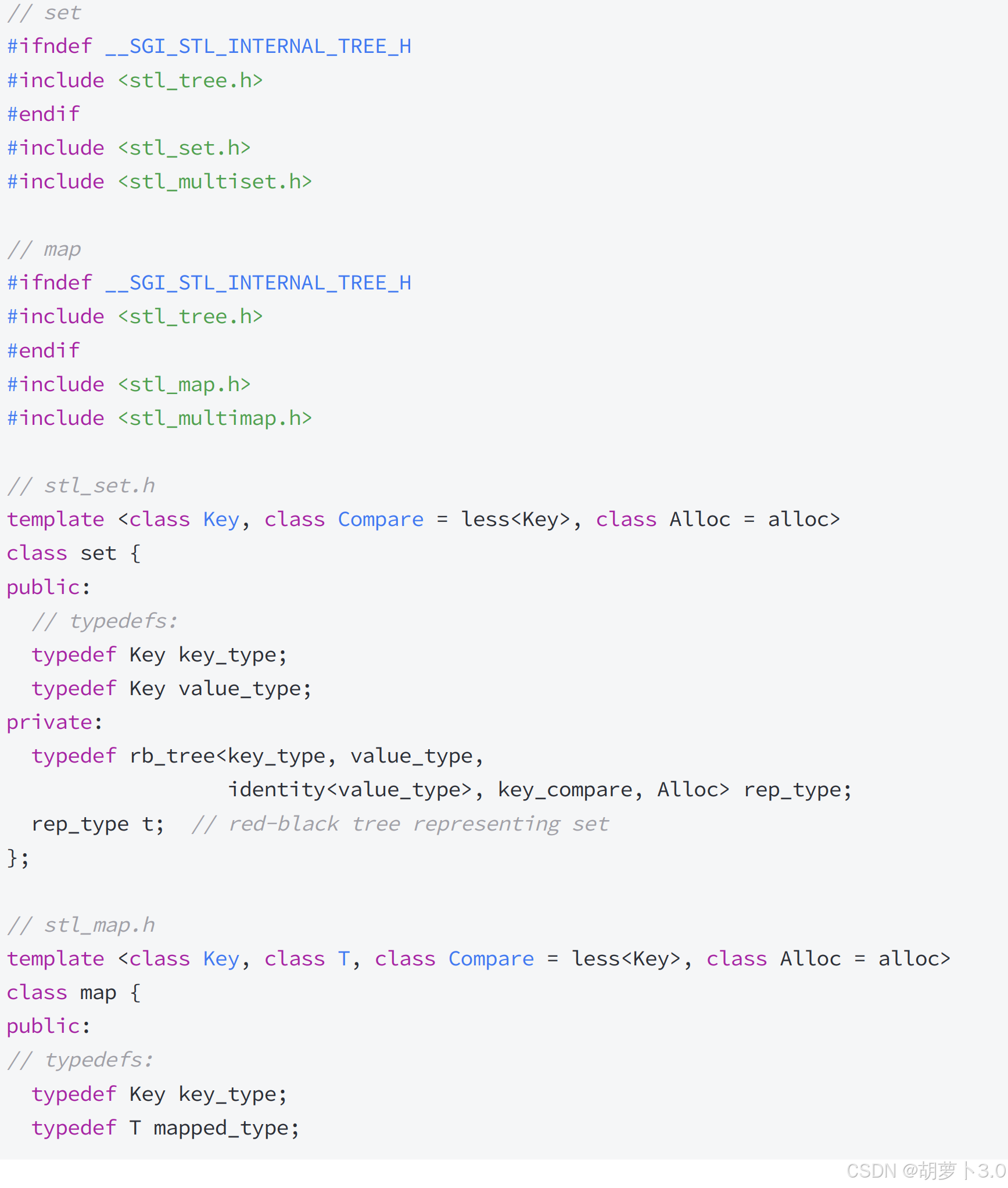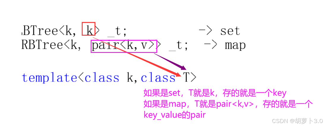 set实例化rb_tree时第二个模板参数给的是key,map实例化rb_tree时第二个模板参数给的是pair<const key,T>,这样一棵红黑树既可以实现key搜索场景的set,也可以实现key/value搜索场景的map