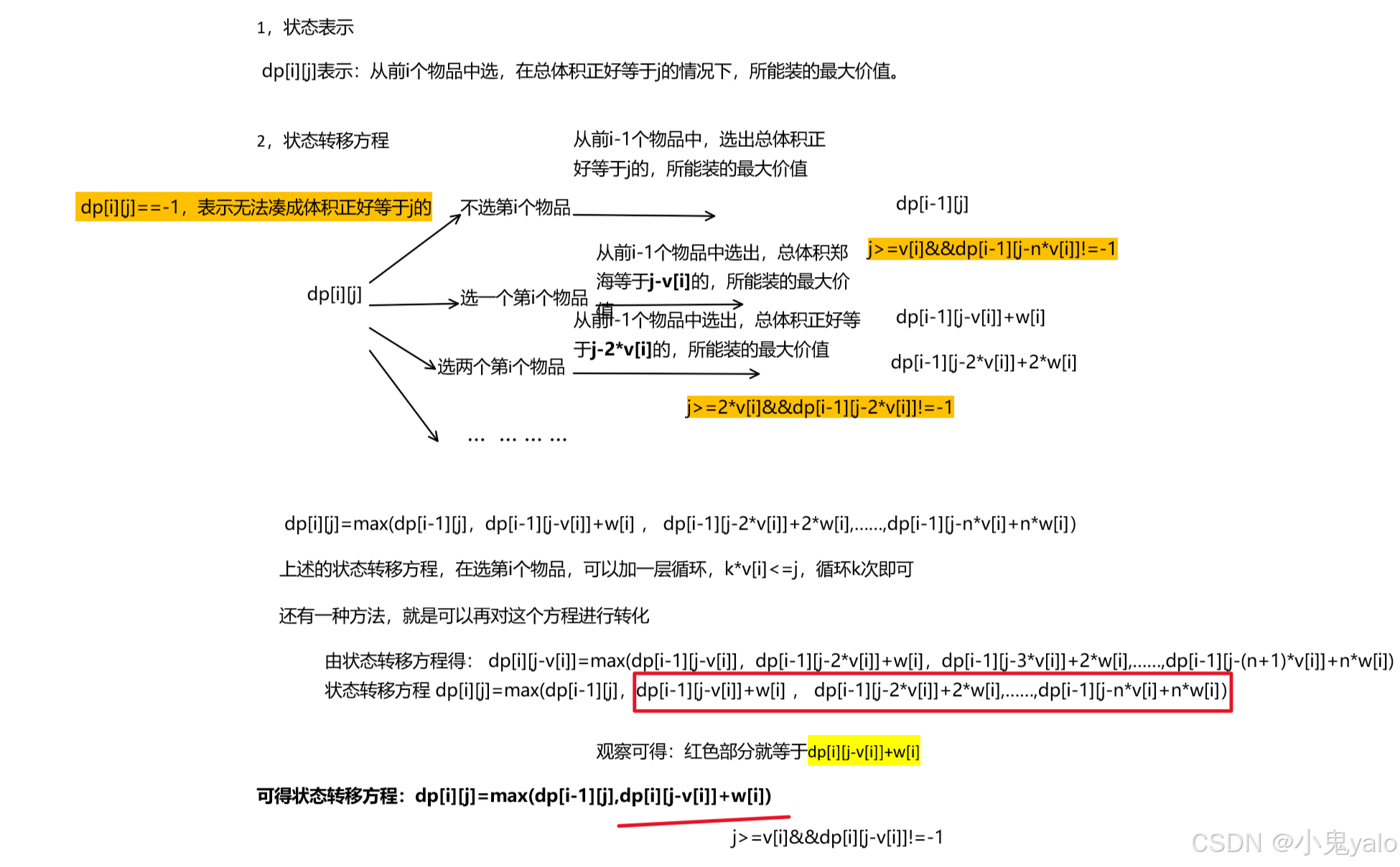 与01背包问题相似,我们定义出状态表示:dp[i][j]表示,在前i个物品中选,总体积不超过j情况下,所能装的最大价值。