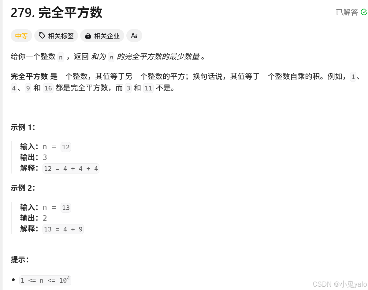 };本题链接:279. 完全平方数 - 力扣(LeetCode)