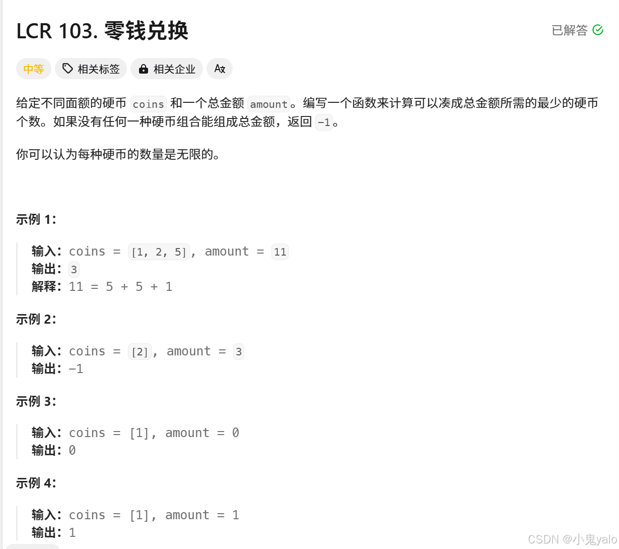 }本题链接:LCR 103. 零钱兑换 - 力扣(LeetCode)