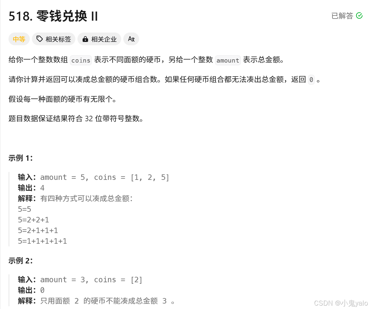 };本题链接:518. 零钱兑换 II - 力扣(LeetCode)
