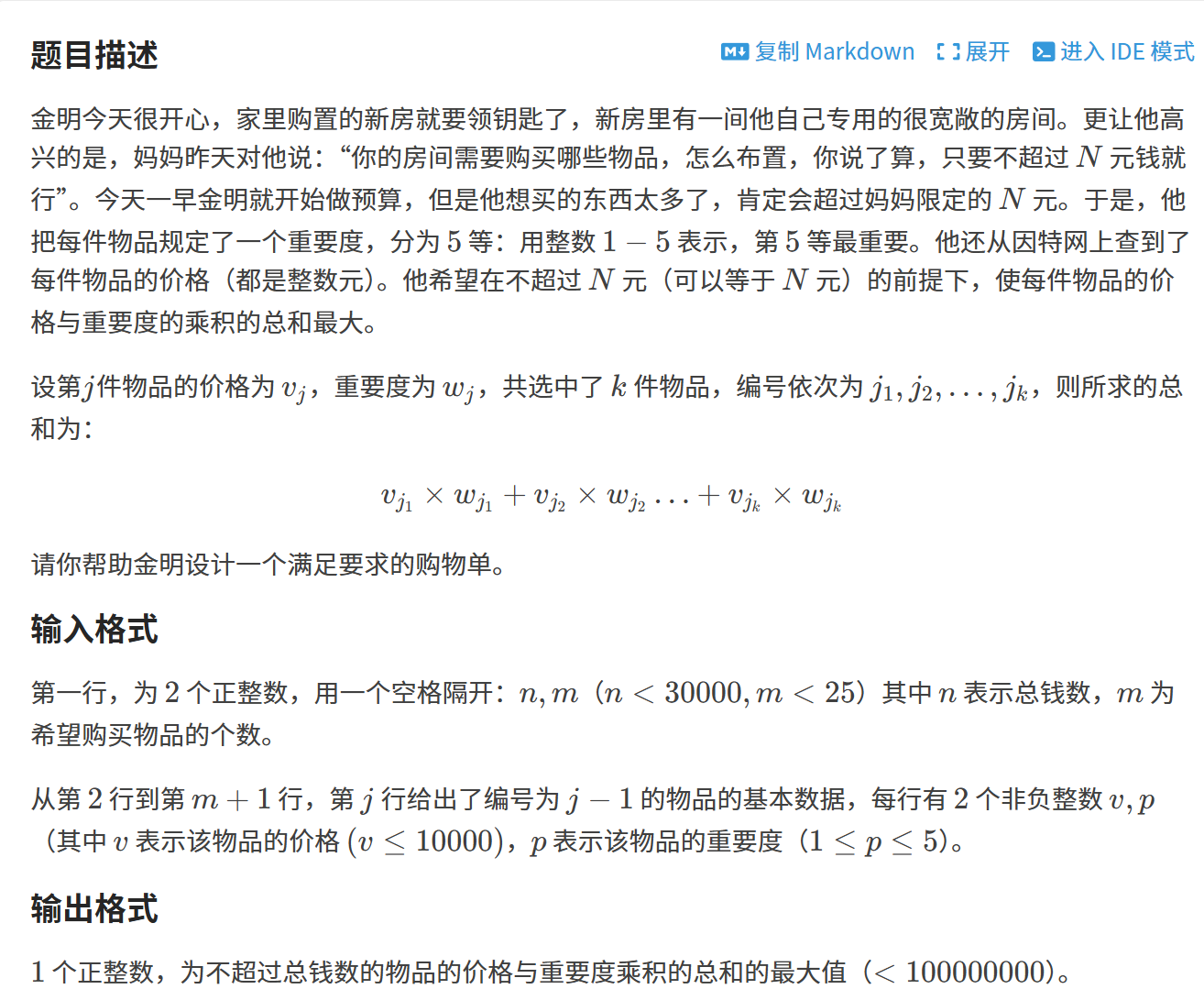 题目链接:P1060 [NOIP 2006 普及组] 开心的金明 - 洛谷