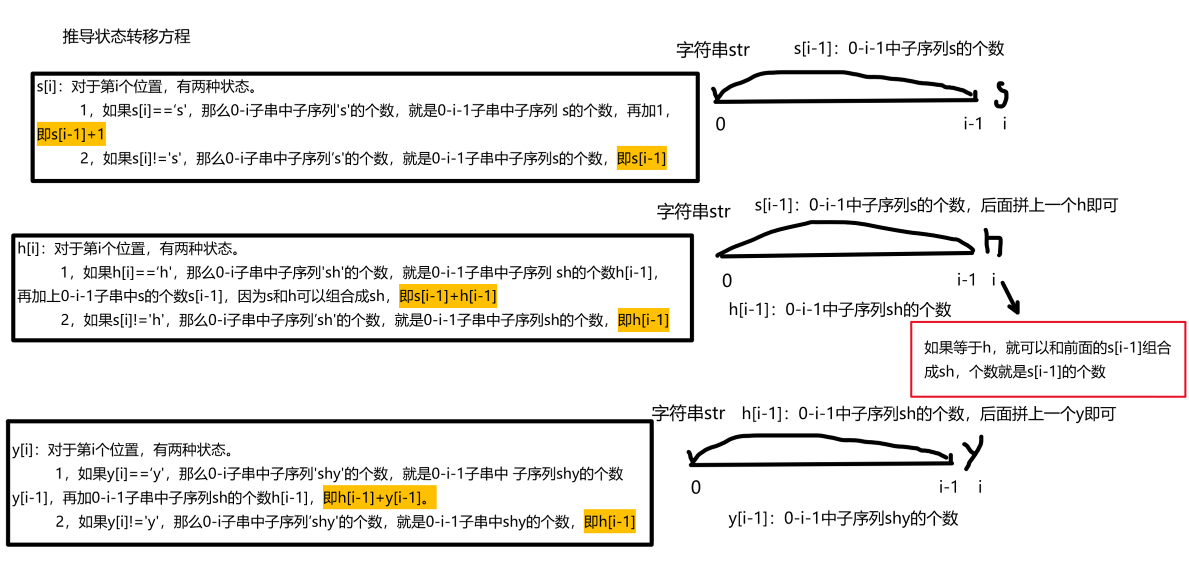 1,如果y[i]==‘y',那么0-i子串中子序列'shy'的个数,就是0-i-1子串中 子序列shy的个数y[i-1],再加0-i-1子串中子序列sh的个数h[i-1],即h[i-1]+y[i-1]。
