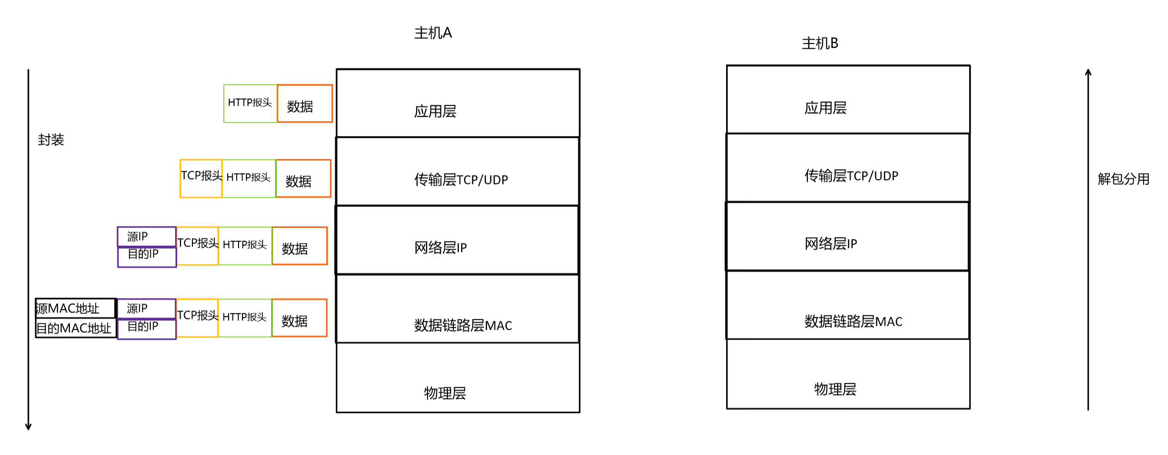 如上图,主机A在 向主机B发送数据的时候,是需要将数据进行一层一层的封装,向下交付,到达网络层,需要封装IP报头,其中包含源IP地址和目标主机的IP地址。到达数据链路层时,需要加上MAC帧报头 ,其中包含源MAC地址和目标主机的MAC地址。
