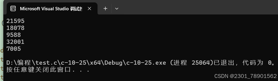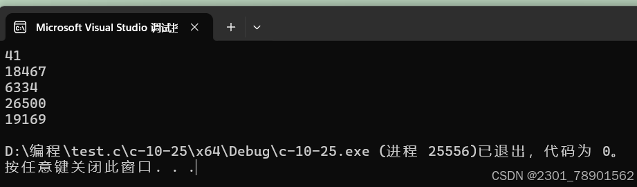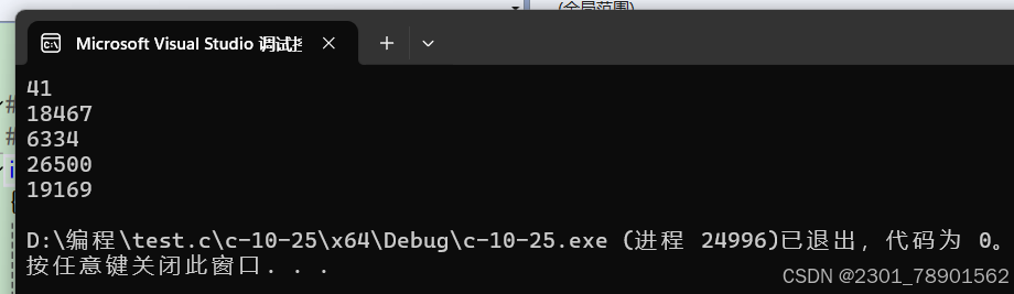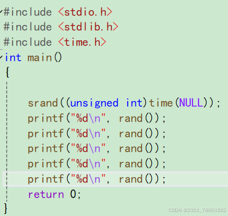 虽然生成了五个随机数;但是我们多次运行时会发现每次生成的随机数都是一样的,这是因为rand函数生成的随机数是一个伪随机数,这种随机数是通过某种算法生成的随机数,其实真正的随机数是无法预测的。rand函数数是对⼀个叫“种⼦”的基准值进⾏运算⽣成的随机数。